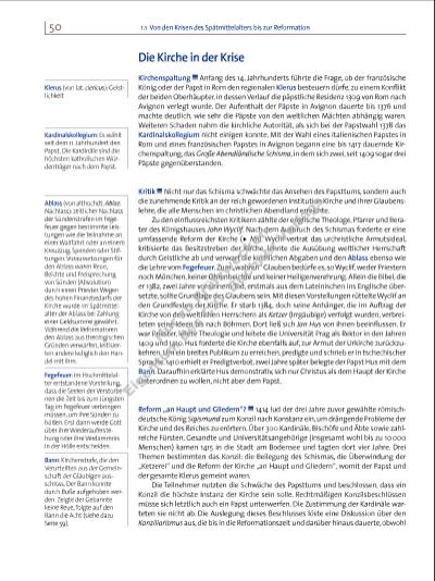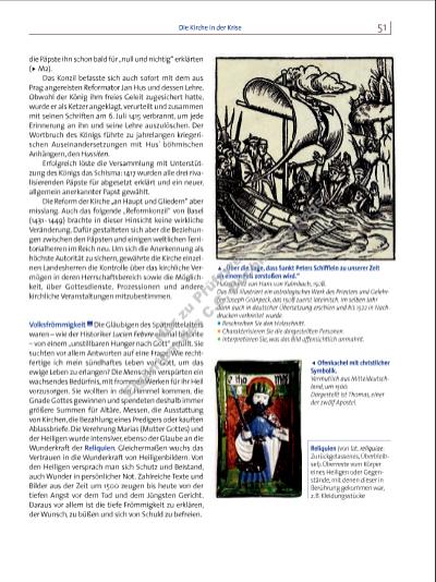 51Die Kirche in der Krise i „Über die Sage, dass Sankt Peters Schiffl ein zu unserer Zeit an einem Fels zerstoßen wird.“ Holzschnitt von Hans von Kulmbach, 1508. Das Bild illustriert ein astrologisches Werk des Priesters und Gelehrten Joseph Grünpeck, das 1508 zuerst lateinisch, im selben Jahr dann auch in deutscher Übersetzung erschien und bis 1522 in Nachdrucken verbreitet wurde. p Beschreiben Sie den Holzschnitt. p Charakterisieren Sie die dargestellten Personen. p Interpretieren Sie, was das Bild offensichtlich anmahnt. die Päpste ihn schon bald für „null und nichtig“ erklärten (u M2). Das Konzil befasste sich auch sofort mit dem aus Prag angereis ten Reformator Jan Hus und dessen Lehre. Obwohl der König ihm freies Geleit zugesichert hatte, wurde er als Ketzer angeklagt, verurteilt und zusammen mit seinen Schriften am 6. Juli 1415 verbrannt, um jede Erinnerung an ihn und seine Lehre auszulöschen. Der Wortbruch des Königs führte zu jahrelangen kriegerischen Auseinandersetzungen mit Hus’ böhmischen Anhängern, den Hussiten. Erfolgreich löste die Versammlung mit Unterstützung des Königs das Schisma: 1417 wurden alle drei rivalisierenden Päpste für abgesetzt erklärt und ein neuer, allgemein anerkannter Papst gewählt. Die Reform der Kirche „an Haupt und Gliedern“ aber misslang. Auch das folgende „Reformkonzil“ von Basel (1431 1449) brachte in dieser Hinsicht keine wirkliche Veränderung. Dafür gestalteten sich aber die Beziehungen zwischen den Päpsten und einigen weltlichen Territorialherren im Reich neu. Um sich die Anerkennung als höchste Autorität zu sichern, gewährte die Kirche einzelnen Landesherren die Kontrolle über das kirchliche Vermögen in deren Herrschaftsbereich sowie die Möglichkeit, über Gottesdienste, Prozessionen und andere kirchliche Veranstaltungen mitzubestimmen. Volksfrömmigkeit Die Gläubigen des Spätmittelalters waren – wie der Historiker Lucien Febvre einmal betonte – von einem „unstillbaren Hunger nach Gott“ erfüllt. Sie suchten vor allem Antworten auf eine Frage: Wie rechtfertige ich mein sündhaftes Leben vor Gott, um das ewige Leben zu erlangen? Die Menschen verspürten ein wachsendes Bedürfnis, mit frommen Werken für ihr Heil vorzusorgen. Sie wollten in den Himmel kommen, die Gnade Gottes gewinnen und spendeten deshalb immer größere Summen für Altäre, Messen, die Ausstattung von Kirchen, die Bezahlung eines Predigers oder kauften Ablassbriefe. Die Verehrung Marias (Mutter Gottes) und der Heiligen wurde intensiver, ebenso der Glaube an die Wunderkraft der Reliquien. Gleichermaßen wuchs das Vertrauen in die Wunderkraft von Heiligenbildern. Von den Heiligen versprach man sich Schutz und Beistand, auch Wunder in persönlicher Not. Zahlreiche Texte und Bilder aus der Zeit um 1500 zeugen bis heute von der tiefen Angst vor dem Tod und dem Jüngsten Gericht. Daraus vor allem ist die tiefe Frömmigkeit zu erklären, der Wunsch, zu büßen und sich von Schuld zu befreien. Reliquien (von lat. reliquiae: Zurückgelassenes, Überbleibsel): Überreste vom Körper eines Heiligen oder Gegenstände, mit denen dieser in Berührung gekommen war, z. B. Kleidungsstücke o Ofenkachel mit christlicher Symbolik. Vermutlich aus Mitteldeutschland, um 1500. Dargestellt ist Thomas, einer der zwölf Apostel. 32015_1_1_2015_Kap1_008-081.indd 51 01.04.15 10:57 Nu r z u Pr üf zw ec ke n Ei ge tu m d es C .C . B uc hn er V er la gs | |