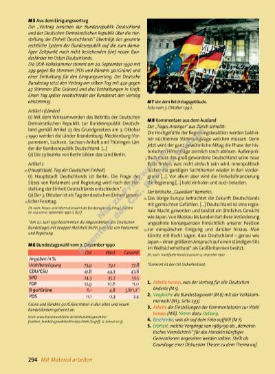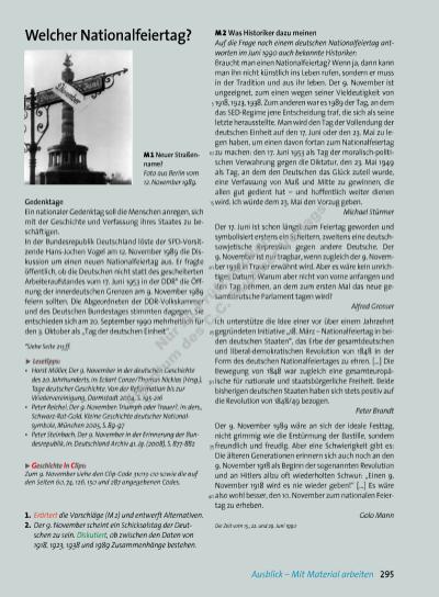 Ausblick – Mit Material arbeiten 295 M 1 Neuer Straßenname? Foto aus Berlin vom 12. November 1989. 5 10 15 20 25 30 35 40 Gedenktage Ein nationaler Gedenktag soll die Menschen anregen, sich mit der Geschichte und Verfassung ihres Staates zu beschäftigen. In der Bundesrepublik Deutschland lös te der SPD-Vorsitzende Hans-Jochen Vogel am 12. November 1989 die Diskussion um einen neuen National feiertag aus. Er fragte öffentlich, ob die Deutschen nicht statt des gescheiterten Arbeiteraufstandes vom 17. Juni 1953 in der DDR* die Öffnung der innerdeutschen Grenzen am 9. November 1989 feiern sollten. Die Abgeordneten der DDR-Volkskammer und des Deutschen Bundestages stimmten dagegen. Sie entschieden sich am 20. September 1990 mehrheitlich für den 3. Oktober als „Tag der deutschen Einheit“. Welcher National feiertag? M 2 Was Historiker dazu meinen Auf die Frage nach einem deutschen Nationalfeiertag antworten im Juni 1990 auch bekannte Historiker: Braucht man einen Nationalfeiertag? Wenn ja, dann kann man ihn nicht künstlich ins Leben rufen, sondern er muss in der Tradition und aus ihr leben. Der 9. November ist ungeeignet, zum einen wegen seiner Vieldeutigkeit von 1918, 1923, 1938. Zum anderen war es 1989 der Tag, an dem das SED-Regime jene Entscheidung traf, die sich als seine letzte herausstellte. Man wird den Tag der Vollendung der deutschen Einheit auf den 17. Juni oder den 23. Mai zu legen haben, um einen davon fortan zum Nationalfeiertag zu machen: den 17. Juni 1953 als Tag der moralisch-politischen Verwahrung gegen die Diktatur, den 23. Mai 1949 als Tag, an dem den Deutschen das Glück zuteil wurde, eine Verfassung von Maß und Mitte zu gewinnen, die allen gut gedient hat – und hoffentlich weiter dienen wird. Ich würde dem 23. Mai den Vorzug geben. Michael Stürmer Der 17. Juni ist schon längst zum Feiertag geworden und symbolisiert erstens ein Scheitern, zweitens eine deutschsow jetische Repression gegen andere Deutsche. Der 9. November ist nur tragbar, wenn zugleich der 9. November 1938 in Trauer erwähnt wird. Aber es wäre kein unrichtiges Datum. Warum aber nicht von vorne anfangen und den Tag nehmen, an dem zum ersten Mal das neue gesamtdeutsche Parlament tagen wird? Alfred Grosser Ich unterstütze die Idee einer vor über einem Jahrzehnt gegründeten Initiative „18. März – Nationalfeiertag in beiden deutschen Staaten“, das Erbe der gesamtdeutschen und liberal-demokratischen Revolution von 1848 in der Form des deutschen Nationalfeiertages zu ehren. […] Die Bewegung von 1848 war zugleich eine gesamteuropäische für nationale und staatsbürgerliche Freiheit. Beide bisherigen deutschen Staaten haben sich stets positiv auf die Revolution von 1848/49 bezogen. Peter Brandt Der 9. November 1989 wäre an sich der ideale Festtag, nicht grimmig wie die Erstürmung der Bastille, sondern freund lich und freudig. Aber eine Schwierigkeit gibt es: Die älteren Generationen erinnern sich auch noch an den 9. November 1918 als Beginn der sogenannten Revolution und an Hitlers allzu oft wiederholten Schwur: „Einen 9. November 1918 wird es nie wieder geben!“ […] Es wäre also wohl besser, den 10. November zum nationalen Feiertag zu erheben. Golo Mann Die Zeit vom 15., 22. und 29. Juni 1990 ˘ Lesetipps: • Horst Möller, Der 9. November in der deutschen Geschichte des 20. Jahrhunderts, in: Eckart Conze/Thomas Nicklas (Hrsg.), Tage deutscher Geschichte. Von der Reformation bis zur Wieder ver einigung, Darmstadt 2004, S. 195-216 • Peter Reichel, Der 9. November: Triumph oder Trauer?, in: ders., Schwarz-Rot-Gold. Kleine Geschichte deutscher Nationalsymbole, München 2005, S. 89-97 • Peter Steinbach, Der 9. November in der Erinnerung der Bundesrepublik, in: Deutschland Archiv 41. Jg. (2008), S. 877-882 ˘ Geschichte In Clips: Zum 9. November siehe den Clip-Code 31013-00 sowie die auf den Seiten 60, 74, 126, 150 und 287 angegebenen Codes. 1. Erörtert die Vorschläge (M 2) und entwerft Alternativen. 2. Der 9. November scheint ein Schicksals tag der Deutschen zu sein. Diskutiert, ob zwischen den Daten von 1918, 1923, 1938 und 1989 Zusammen hänge bestehen. *Siehe Seite 215 ff. 31013_1_1_2015_272_319_kap6.indd 295 26.03.15 15:34 Nu r z u Pr üf zw ec ke n Ei ge nt um d es C .C . B uc hn er V er la gs | |