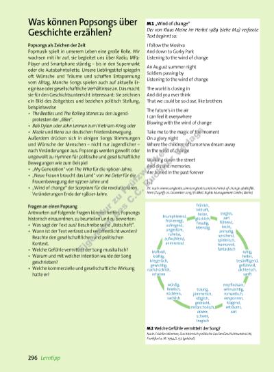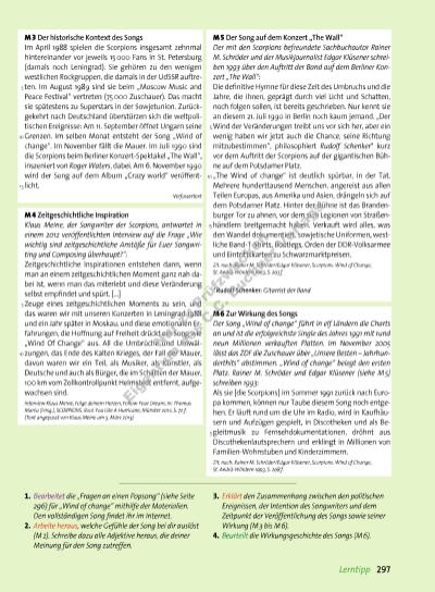 Lerntipp 297 1. Bearbeitet die „Fragen an einen Popsong“ (siehe Seite 296) für „Wind of change“ mithilfe der Materialien. Den vollständigen Song fi ndet ihr im Internet. 2. Arbeite heraus, welche Gefühle der Song bei dir auslöst (M 2). Schreibe dazu alle Adjektive heraus, die deiner Meinung für den Song zutreffen. 3. Erklärt den Zusammenhang zwischen den politischen Ereignissen, der Intention des Songwriters und dem Zeitpunkt der Veröffentlichung des Songs sowie seiner Wirkung (M 3 bis M 6). 4. Beurteilt die Wirkungsgeschichte des Songs (M 6). 5 10 15 5 10 15 5 5 10 M 3 Der historische Kontext des Songs Im April 1988 spielen die Scorpions insgesamt zehnmal hintereinander vor jeweils 15 000 Fans in St. Petersburg (damals noch Leningrad). Sie gehören zu den wenigen west lichen Rockgruppen, die damals in der UdSSR auftreten. Im August 1989 sind sie beim „Moscow Music and Peace Festival“ vertreten (75 000 Zuschauer). Das macht sie spätestens zu Superstars in der Sowjetunion. Zurückgekehrt nach Deutschland überstürzen sich die weltpolitischen Ereignisse: Am 11. September öffnet Ungarn seine Grenzen. Im selben Monat entsteht der Song „Wind of change“. Im November fällt die Mauer. Im Juli 1990 sind die Scorpions beim Berliner Konzert-Spektakel „The Wall“, inszeniert von Roger Waters, dabei. Am 6. November 1990 wird der Song auf dem Album „Crazy world“ veröffentlicht. Verfassertext M 6 Zur Wirkung des Songs Der Song „Wind of change“ führt in elf Ländern die Charts an und ist die erfolgreichste Single des Jahres 1991 mit rund neun Millionen verkauften Platten. Im November 2005 lässt das ZDF die Zuschauer über „Unsere Besten – Jahrhunderthits“ abstimmen. „Wind of change“ belegt den ersten Platz. Rainer M. Schröder und Edgar Klüsener (siehe M 5) schreiben 1993: Als sie [die Scorpions] im Sommer 1991 zurück nach Europa kommen, können nur Taube diesem Song noch entgehen. Er läuft rund um die Uhr im Radio, wird in Kaufhäusern und Aufzügen gespielt, in Discotheken und als Begleitmusik zu Fernsehdokumentationen, dröhnt aus Discothekenlautsprechern und erklingt in Millionen von Familien-Wohnstuben und Kinderzimmern. Zit. nach: Rainer M. Schröder/Edgar Klüsener, Scorpions. Wind of Change, St. Andrä-Wördern 1993, S. 268 f. M 4 Zeitgeschichtliche Inspiration Klaus Meine, der Songwriter der Scorpions, antwortet in einem 2012 veröffentlichten Interview auf die Frage „Wie wichtig sind zeitgeschichtliche Anstöße für Euer Songwriting und Composing überhaupt?“: Zeitgeschichtliche Inspirationen entstehen dann, wenn man an einem zeitgeschichtlichen Moment ganz nah dabei ist, wenn man das miterlebt und diese Veränderung selbst empfi ndet und spürt. [...] Zeuge eines zeitgeschichtlichen Moments zu sein, und das waren wir mit unseren Konzerten in Leningrad 1988 und ein Jahr später in Moskau, und diese emotionalen Erfahrungen, die Hoffnung auf Freiheit drückt ein Song wie „Wind Of Change“ aus. All die Umbrüche und Umwälzungen, das Ende des Kalten Krieges, der Fall der Mauer, davon waren wir ein Teil, als Musiker, als Künstler, als Deutsche und auch als Bürger, die im Schatten der Mauer, 100 km vom Zollkontrollpunkt Helmstedt entfernt, aufgewachsen sind. Interview Klaus Meine, Folge deinem Herzen, Follow Your Dream, in: Thomas Mania (Hrsg.), SCORPIONS. Rock You Like A Hurricane, Münster 2012, S. 72 f. (Text angepasst von Klaus Meine am 5. März 2015) M 5 Der Song auf dem Konzert „The Wall“ Der mit den Scorpions befreundete Sachbuchautor Rainer M. Schröder und der Musikjournalist Edgar Klüsener schreiben 1993 über den Auftritt der Band auf dem Berliner Konzert „The Wall“: Die defi nitive Hymne für diese Zeit des Umbruchs und die Jahre, die ihnen, geprägt durch viel Licht und Schatten, noch folgen sollen, ist bereits geschrieben. Nur kennt sie an diesem 21. Juli 1990 in Berlin noch kaum jemand. „Der Wind der Veränderungen treibt uns vor sich her, aber ein wenig haben wir jetzt auch die Chance, seine Richtung mitzubestimmen“, philosophiert Rudolf Schenker* kurz vor dem Auftritt der Scorpions auf der gigantischen Bühne auf dem Potsdamer Platz. „The Wind of change“ ist deutlich spürbar, in der Tat. Mehrere hunderttausend Menschen, angereist aus allen Teilen Europas, aus Amerika und Asien, drängeln sich auf dem Potsdamer Platz. Hinter der Bühne ist das Brandenburger Tor zu ahnen, vor dem sich Legionen von Straßenhändlern breitgemacht haben. Verkauft wird alles, was den Wandel dokumentiert, sowjetische Uniformen, westliche Band-T-Shirts, Bootlegs, Orden der DDR-Volksarmee und Eintrittskarten zu Schwarzmarktpreisen. Zit. nach: Rainer M. Schröder/Edgar Klüsener, Scorpions. Wind of Change, St. Andrä-Wördern 1993, S. 263 f. * Rudolf Schenker: Gitarrist der Band 31013_1_1_2015_272_319_kap6.indd 297 26.03.15 15:34 Nu r z u Pr üf zw ec ke n Ei ge nt um d es C .C . B uc hn er V er la gs | |