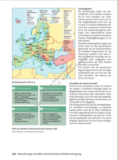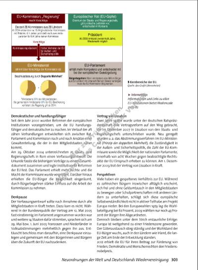 303Neuordnungen der Welt und Deutschlands Wiedervereinigung ˘ Internettipp: Informationen und Links zu allen EU-Institutionen bietet Mediencode 31013-82 Vertrag von Lissabon Zwei Jahre später wurde unter der deutschen Ratspräsidentschaft eine Vertragsreform auf den Weg gebracht, die im Dezember 2007 in Lissabon von den Staatsund Regierungschefs unterschrieben wurde. Neu geregelt wurden u. a. das Abstimmungsverfahren im EU-Ministerrat (Prinzip der doppelten Mehr heit), die Zuständigkeit in der Außenund Sicherheitspolitik, die Zahl der EU-Kommissare sowie die Möglichkeit der nationalen Parlamente, innerhalb von acht Wochen gegen beabsichtigte Rechtsakte der EU Einspruch erheben zu können. Am 1. Dezember 2009 trat der Vertrag von Lissabon in Kraft. Perspektiven Viele haben ein gespaltenes Verhältnis zur EU. Während es zahlreichen Bürgern inzwischen alltäglich erscheint, sich frei und ohne Geldumtausch in den Mitgliedstaaten zu bewegen oder Schulpartnerschaften mit anderen Ländern zu unterhalten, schlägt sich diese europäische Selbstverständlichkeit nicht in aktiver Teilhabe am Projekt Europa nieder: Bei den Europawahlen 1979 lag die Wahlbeteiligung bei 62 Prozent, 2009 wählten nur noch 43 Prozent der Bürger ihre Abgeordneten. Dennoch bleiben unter dem Strich erstaunliche Erfolge: Europa ist weitgehend zu einer Friedenszone geworden. Der Güteraustausch stieg ständig und der Wohlstand der EU-Bürger wuchs, auch in den Ländern wie Irland, die lange Zeit am Ende der Entwicklung standen. 2012 erhielt die EU für ihren Beitrag zur Förderung von Frieden, Demokratie und Menschenrechten den Friedensnobelpreis. Demokratischer und handlungsfähiger Seit dem Jahr 2000 wurden Reformen der europäischen Institutionen vorangetrieben, um die EU handlungsfähiger und demokratischer zu machen. Im Verlauf der oft zähen Verhandlungen entwickelten sich zwischen Rat, Parlament und Kommission nach und nach Ansätze einer Gewaltenteilung, die der in den Mitgliedstaaten näher kommt. Am 29. Oktober 2004 unterzeichneten 25 Staatsund Regierungschefs in Rom einen Verfassungsentwurf. Die Urkunde fasste die bisherigen Verträge zu einem Gesamtdokument zusammen und legte institutionelle Reformen der EU fest. Das Parlament erhielt mehr Rechte und die Macht der Kommissare wurde vergrößert. Darüber hinaus erhielten die EU-Bürger die Möglichkeit eingeräumt, durch Bürgerbegehren stärker Einfl uss auf die Arbeit der Kommission zu nehmen. Denkpause Der Verfassungsentwurf sollte nach Annahme durch alle Mitgliedstaaten in Kraft treten. Dazu kam es nicht. Während in der Bundesrepublik der Vertrag am 12. Mai 2005 fast ein stimmig im Parlament angenommen worden war und weitere 14 Staaten da für stimmten, sprachen sich am 29. Mai bzw. 1. Juni 2005 Franzosen und Niederländer in Volksabstimmungen mehr heitlich gegen ihn aus. Enttäuscht beschloss man daraufhin, eine Denkpause einzulegen und gemeinsam mit den Bürgerinnen und Bürgern über die Zukunft der EU nachzudenken. Kommissionspräsident EU-Kommission, „Regierung“ Derzeit 28 Kommissare aus 28 Ländern Ab 2014 entsenden nur 15 Mitgliedsländer Kommissare mit Rotation, d. h. jedes Land stellt nach zwei Amtsperioden für fünf Jahre keinen Kommissar. macht Vorschläge Vorschläge Hoher Vertreter der EU für Außenund Sicherheitspolitik EU-Ministerrat stimmt über Vorschläge der Kommission ab Beschlussfassung durch Doppelte Mehrheit*: *Mindestens 55% der Mitgliedstaaten, die gemeinsam mindestens 65% der EU-Bevölkerung vertreten; die Regelung gilt ab 2014. Europäischer Rat (EU-Gipfel) Gremium der Staatsund Regierungschefs, gibt politische Leitlinien vor, entscheidet im Konsens Präsident Ab 2009 Amtszeit zweieinhalb Jahre, Wiederwahl möglich EU-Parlament erhält mehr Kompetenz und entscheidet mit bei der europäischen Gesetzgebung Bürgerbegehren: Wenn mindestens eine Million Bürger aus EU-Ländern mit Unterschriften ein Gesetz verlangen, muss die EU-Kommission tätig werden. 55% 65%+ 5 Kernbereiche der EU. Quelle: dpa-Grafi k (überarbeitet) 31013_1_1_2015_272_319_kap6.indd 303 26.03.15 15:34 Nu r z u Pr üf zw ec ke n Ei ge nt um d es C .C . B uc hn er V er la gs | |
