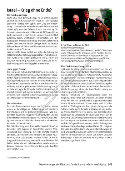 305Neuordnungen der Welt und Deutschlands Wiedervereinigung Israel – Krieg ohne Ende? Eine Zwei-Staaten-Lösung in Sicht 1988 erklärte König Hussein von Jordanien, auf das von Israel besetzte Westjordanland (Westbank) verzichten zu wollen. Daraufhin tagte der Palästinensische Nationalrat in Algier und rief einen unabhängigen Palästinenserstaat mit der Hauptstadt Jerusalem aus. Gleichzeitig erklärten sich die Palästinenser bereit, Israel auf der Grundlage bestehender UN-Resolutionen anzuerkennen. Doch die israelische Regierung lehnte die Zwei-Staaten-Lösung der „Terrororganisation“ PLO ab. Weitere Fortschritte im Friedensprozess waren erst möglich, als sich Israel auf Druck der USA bereit erklärte, direkt mit der PLO zu verhandeln. 1993 unterzeichneten Israels Ministerpräsident Yitzhak Rabin und PLO-Chef Arafat in Washington die Prinzipienerklärung über die Selbstverwaltung der Gebiete um Gaza und Jericho (Gaza-Jericho-Abkommen). Eine Wende des Konfl ikts schien nahe. Doch die Umsetzung der Grundsätze erwies sich als schwierig. Obwohl die palästinensische Selbstverwaltung in Gaza begann und weitere Abkommen zwischen Israel und der PLO geschlossen wurden, störten Anhänger der ra di kalen islamischen Organisation Hamas (dt.: religiöser Eifer; Abkürzung für „islamische Widerstandsbewegung“) und uneinsichtige jüdische Siedler den Friedensprozess. Obwohl im November 1995 Rabin von einem jüdischen Extremisten in Tel Aviv ermordet wurde, schien ein Frieden aber in greifbarer Nähe. Die Palästinenserfrage Sechs Jahre nach dem Sechs-Tage-Krieg* griffen Ägypten und Syrien am 6. Oktober 1973 Israel an – am höchsten jüdischen Feiertag Jom Kippur, dem „Tag der Versöhnung“. Die israelische Armee konnte sich behaupten und die seit 1967 besetzten Gebiete sichern, bevor am 24. Oktober ein von den Vereinten Nationen (UNO) vermittelter Waffenstillstand in Kraft trat. Er kam auf Druck der USA zustande, Israels wichtigstem Verbündeten. Um den Rückzug der Israelis doch noch zu erreichen, lieferten die Araber dem Westen danach weniger Erdöl zu deutlich höheren Preise als bisher und lösten damit in den Industrieländern eine Ölkrise aus. 1974 erreichte Yassir Arafat, der 1969 die Leitung der Palästinensischen Befreiungsorganisation (PLO) übernommen hatte, einen ersten politischen Erfolg, indem die UNO das Recht des palästinensischen Volkes auf Selbstbestimmung und Unabhängigkeit anerkannten. „Land gegen Frieden“ Die Fronten im Nahost-Konfl ikt lockerten sich, als die verfeindeten Mächte die Formel „Land gegen Frieden“ akzeptierten. Ägypten erkannte Israels Exis tenz recht zuerst an. Als Gegenleistung dafür sollte es die Sinai-Halbinsel zurückerhalten. 1979 wurde der durch amerikanische Vermittlung zustande gekommene Friedensvertrag unterschrieben. Er legte die Rückgabe des Sinai bis 1982 fest. Im arabischen Lager galt Ägypten danach als Verräter. 1981 ermordete ein Extremist in Kairo Staatspräsident Anwar as-Sadat wegen seiner Friedenspolitik. Die Erste Intifada Trotz der Friedensbeteuerungen der PLO kam es immer wieder zu Anschlägen der Palästinenser auf israelische Einrichtungen und die jüdische Bevölkerung. 1982 marschierten israelische Truppen im benachbarten Libanon ein und forderten den Abzug der PLO-Kämpfer. Gleichzeitig besetzten sie im Süden des Libanons eine zehn Kilometer breite „Sicherheitszone“. Die Palästinenser gaben ihren Widerstand nicht auf. Im Dezember 1987 begann im Gazastreifen und im Westjordanland eine Erhebung: die Erste Intifada (wörtlich übersetzt: „abschütteln“). Der Aufstand der jungen Palästinenser, die nichts anderes erfahren hatten als Besatzung und Unterdrückung, war nicht einzudämmen. Auf beiden Seiten starben viele Menschen. Israel musste erkennen, dass eine rein militärische Lösung des Konfl ikts nicht möglich war. 1 Eine Wende im Nahost-Konfl ikt? Foto vom 13. September 1993. Israels Ministerpräsident Yitzhak Rabin (l.) und PLO-Führer Yassir Arafat (r.) besiegeln unter den Augen von US-Präsident Bill Clinton im Garten des Weißen Hauses in Washington das Gaza Jericho-Abkommen. Rabin und Arafat erhielten 1994 für ihre Verständigungsbemühungen den Friedensnobelpreis. * Lies dazu nochmals Seite 222. 31013_1_1_2015_272_319_kap6.indd 305 26.03.15 15:34 Nu r z u Pr üf zw ec k n Ei ge nt um d es C .C . B uc hn er V rla gs | |