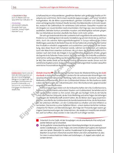 schaftswachstum mitzuverdienen, gewährten Banken sehr großzügig Kredite an Privatpersonen und Firmen. Der Konsum wurde bis 1929 sozusagen „auf Pump“ künstlich hochgehalten. Als die Börse zusammenbrach, gerieten Schuldner und Gläubiger in einen verhängnisvollen Kreislauf: Käufer konnten ihre Ratenkredite nicht mehr bezahlen, wodurch die Geldinstitute ihr verliehenes Geld verloren. Daraufhin mussten sie die Vergabe von neuen Krediten stark einschränken. Die Folge war, dass Investitionen ausblieben, Betriebe Konkurs anmelden mussten und Arbeitsplätze verloren gingen. Die nun Arbeitslosen konnten ebenfalls ihre Raten nicht mehr zahlen. Die seit 1921 bestehende Krise der Landwirtschaft vergrößerte die wirtschaftlichen Probleme noch. Bedingt durch die starke Verstädterung seit dem Ende des 19. Jahrhunderts, durch die extreme Nahrungsmittelknappheit in Europa während des Ersten Weltkrieges sowie durch die Bedürfnisse der Armee hatten die amerikanischen Farmer ihre Produktion erheblich ausgeweitet und zusätzliches Land kultiviert. In der Erwartung, dass dieser Boom sich fortsetzen würde, nahmen sie Kredite auf, um weiteres Land oder Maschinen erwerben zu können. Als sich dann die landwirtschaftliche Produktion nach dem Ende des Krieges in Europa schneller als gedacht erholte, gingen die Exporte trotz fallender Preise zurück. Die Folge war, dass die Einkünfte ausblieben, viele Farmer zahlungsunfähig wurden und Hypotheken nicht mehr bezahlen konnten (u M5). Dies wirkte direkt auf die Banken zurück. Sie bekamen weder Zinsen noch ihr verliehenes Kapital zurück. Aufgrund mangelnder Zahlungsmittel mussten daraufhin viele kleine Finanzinstitute Bankrott anmelden. Globale Ursachen Viele Ökonomen machen heute die Wiedereinführung des Goldstandards in mehreren europäischen Ländern für die verheerenden Krisenfolgen mitverantwortlich. Vor dem Ersten Weltkrieg hatte eine robuste, konstant wachsende Weltwirtschaft bestanden. Durch den Goldstandard blieben die Wechselkurse stabil, sodass die Währungen der Industriestaaten ohne Wechselkursrisiko gegeneinander ausgetauscht werden konnten. Während des Krieges lösten sich die Volkswirtschaften der USA, Großbritanniens, Frankreichs, Deutschlands und anderer Staaten vom Goldstandard. Sie kehrten erst in den 1920er-Jahren wieder zu ihm zurück. Dies gilt aus heutiger Sicht als der falsche Schritt zum falschen Zeitpunkt, da der Erste Weltkrieg und seine Folgen die bisherigen Grundlagen der Weltwirtschaft zerstört hatten. Als die Börsen dann 1929 zusammenbrachen, verschärfte der Goldstandard die bereits bestehende Krise, da die Notenbanken die Leitzinsen erhöhten, um den Goldstandard zu erhalten und eine Infl ation zu vermeiden. Dies konnte zu einer Defl ation führen – einem starken Verfall der Verbraucherpreise für Waren und Dienstleistungen. Die Folge der Preissenkungen waren geringere Gewinnerwartungen der Unternehmen, die wiederum Investitionen einstellten, weil sie hofften, diese würden in der Zukunft noch billiger werden. Literaturtipp: John Kenneth Galbraith, Der große Crash 1929. Ursachen, Verlauf, Folgen, München 42009 Goldstandard: Damit wird der Wert der Währung eines Landes durch eine festgelegte Menge an Gold gesichert. Die jeweiligen Zentralbanken deponieren Goldvorräte und sind zum Anund Verkauf von Gold gegen ihre Banknoten verpfl ichtet. Entwickeln Sie eine Grafi k, mit der Sie aufzeigen, wie die amerikanische Krise verlief und welche Faktoren auf sie einwirkten. H Für die grafi sche Veranschaulichung einer Entwicklung benötigen Sie ein ausdrucksstarkes Grundkonzept, z. B. eine Treppe, eine Sonne (Strahlen nach außen), eine Explosion oder eine Spirale. Überprüfen Sie, welches Grundkonzept Sie für angemessen halten. Beachten Sie auch den Unterschied zwischen Pfeilen und Linien und bedenken Sie, dass Sie Linien in unterschiedlichen Farben und Gestaltungen, z. B. doppelt oder einfach, verwenden können. u Geschichte In Clips: Zum US-Börsencrash von 1929 siehe Clip-Code 4677-06 94 Ursachen und Folgen der Weltwirtschaftskrise 1929 4677_1_1_2015_090-127_Kap3.indd 94 17.07.15 11:42 Nu r z u P üf zw ec ke n Ei ge nt um d es C .C .B uc h er V er l gs | |