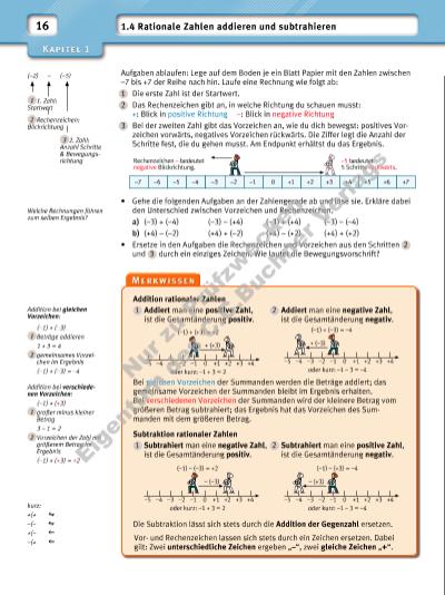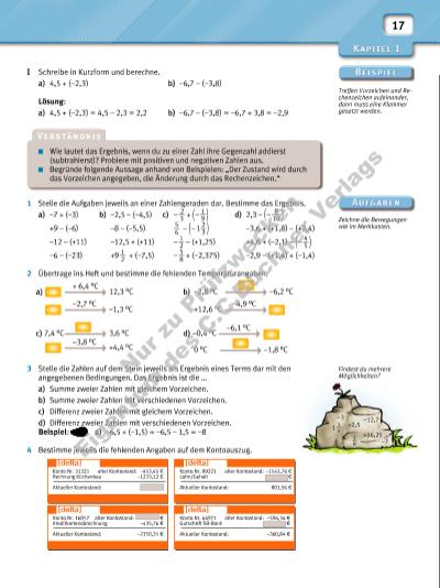 17 –3 +2,5 –12,7 1 3 __ 4 1 __ 9 +16,25 –7 I Schreibe in Kurzform und berechne. a) 4,5 + (–2,3) b) –6,7 – (–3,8) Lösung: a) 4,5 + (–2,3) = 4,5 – 2,3 = 2,2 b) –6,7 – (–3,8) = –6,7 + 3,8 = –2,9 Wie lautet das Ergebnis, wenn du zu einer Zahl ihre Gegenzahl addierst (subtrahierst)? Probiere mit positiven und negativen Zahlen aus. Begründe folgende Aussage anhand von Beispielen: „Der Zustand wird durch das Vorzeichen angegeben, die Änderung durch das Rechenzeichen.“ 1 Stelle die Aufgaben jeweils an einer Zahlengeraden dar. Bestimme das Ergebnis. a) –7 + (–3) b) –2,5 – (–4,5) c) – 2 __ 3 + ( – 1 __ 9 ) d) 2,3 – ( – 8 ___ 10 ) +9 – (–6) –8 – (–5,5) 5 __ 6 – ( – 1 2 __ 3 ) –3,6 + (+1,8) – (+2,4) –12 – (+11) –12,5 + (+11) – 1 __ 2 – (+1,25) +4,6 + (–2,1) – ( – 4 __ 5 ) –6 – (–23) +9 1 __ 2 + (–7,5) – 5 __ 8 + (–2,375) –2,9 – (+1,4) + (–1,4) 2 Übertrage ins Heft und bestimme die fehlenden Temperaturangaben. 3 Stelle die Zahlen auf dem Stein jeweils als Ergebnis eines Terms dar mit den angegebenen Bedingungen. Das Ergebnis ist die … a) Summe zweier Zahlen mit gleichem Vorzeichen. b) Summe zweier Zahlen mit verschiedenen Vorzeichen. c) Differenz zweier Zahlen mit gleichem Vorzeichen. d) Differenz zweier Zahlen mit verschiedenen Vorzeichen. Beispiel: –8: a) –6,5 + (–1,5) = –6,5 – 1,5 = –8 4 Bestimme jeweils die fehlenden Angaben auf dem Kontoauszug. a) b) –6,2 °C–2,8 °C +12,6 °C –4,9 °C + 6,4 °C 12,3 °C –2,7 °C –1,3 °C c) d)7,4 °C –0,4 °C –6,1 °C 3,6 °C –3,8 °C +4,4 °C –1,8 °C0 °C Findest du mehrere Möglichkeiten? Zeichne die Bewegungen wie im Merkkasten. Treffen Vorzeichen und Rechenzeichen aufeinander, dann muss eine Klammer gesetzt werden. Konto Nr. 31321 alter Kontostand: –453,45 f Rechnung Küchenbau –1233,12 f Aktueller Kontostand: [delta] Konto Nr. 89221 alter Kontostand: –1543,76 f Lohn/Gehalt f Aktueller Kontostand: 801,56 f [delta] Konto Nr. 16057 alter Kontostand: f Kreditkartenabrechnung –435,76 f Aktueller Kontostand: –2350,31 f [delta] Konto Nr. 64971 alter Kontostand: –596,34 f Gutschrift SB-Bank f Aktueller Kontostand: –360,84 f [delta] Nu r z u Pr üf zw ec ke n Ei ge nt um d es C .C .B uc hn er V er la gs | |