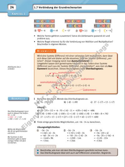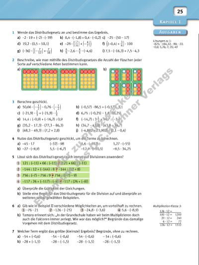 25 1 Wende das Distributivgesetz an und bestimme das Ergebnis. a) –2 · 19 + (–2) · (–39) b) 0,4 · (–1,8) + 0,4 · (–0,2) c) –25 · (50 – 17) d) 19,2 · (0,5 – 10,1) e) –28 · ( ( 7 __ 4 ) + ( – 4 __ 7 ) ) f) ( ( –0,4 ) + 3 __ 4 ) · 100 g) (–36) · ( ( – 7 ___ 12 ) + 7 ___ 18 ) h) 4 __ 5 · 2,6 – 4 __ 5 · (–4,6) i) 7,5 · (–16,3) + 7,5 · 4,3 2 Beschreibe, wie man mithilfe des Distributivgesetzes die Anzahl der Flaschen jeder Sorte auf verschiedene Arten bestimmen kann. a) b) 3 Berechne geschickt. a) 50,66 · ( – 1 __ 2 ) – 0,76 · ( – 1 __ 2 ) b) (–0,57) · 86,5 + (–0,57) · 3,1 c) (–21,9) · 1 __ 3 + (–21,9) · 1 __ 3 d) 6,75 : (–0,25) – 1,8 : (0,25) e) 14,4 : (–0,9) + (–16,2) : 0,9 f) (–14,7) : 3 1 __ 2 + 14,7 : ( –3 1 __ 2 ) g) (35,2 – 17,3) · (77,3 – 86,3) h) (34,7 – 43,8) · (43,8 – 34,7) i) (48,3 – 49,3) : (7,2 + 2,8) j) (–4,802 + 23,902) : (2,1 – 0,4) 4 Nutze das Distributivgesetz geschickt, um die Terme zu berechnen. a) –45 · 17 (–32) · 98 1,6 · (–102) 1,27 · (–55) b) –27 · (–9,9) 5,5 · (–6,7) –12,9 · (–10,5) –9,5 · 34,25 5 Lässt sich das Distributivgesetz auch immer auf Divisionen anwenden? 1 121 : (–11) + 66 : (–11) = (121 + 66) : (–11) 2 –144 : 12 + (–144) : 8 = –144 : (12 + 8) 3 756 : (–7) – 756 : 9 = 756 : ((–7) – 9) 4 –117 : 26 + (–117) : (–9) = –117 : (26 + (–9)) a) Überprüfe die Gültigkeit der Gleichungen. b) Stelle eine Regel für das Distributivgesetz für die Division auf und überprüfe an weiteren selbst gewählten Beispielen. 6 a) Gib wie in Beispiel II verschiedene Möglichkeiten an, um vorteilhaft zu rechnen. 1 –76 · 21 2 –126 · (–25) 3 –24,8 · (–3,6) 4 5,6 · (–8,9) b) Tamara erinnert sich: „In der Grundschule haben wir beim Multiplizieren doch auch die Faktoren immer zerlegt. Wie war das möglich?“ Begründe das damalige Vorgehen mit dem Distributivgesetz. 7 Welcher Term ergibt das größte (kleinste) Ergebnis? Begründe, ohne zu rechnen. a) –54 + (–0,6) –54 – (–0,6) –54 · (–0,6) – 54 : (–0,6) b) –28 + (–1,5) –28 – (–1,5) –28 · (–1,5) –28 : (–1,5) Lösungen zu 1: –825; –184,32; –90; –33; –0,8; 5,76; 7; 35; 40 Multiplikation Klasse 3: 126 · 12 = 100 · 12 = 1200 20 · 12 = 240 6 · 12 = 72 126 · 12 = 1512 Nu r z u Pr üf zw ec ke n Ei en tu m d es C .C .B uc hn er V er la gs | |