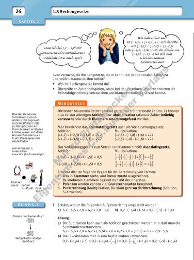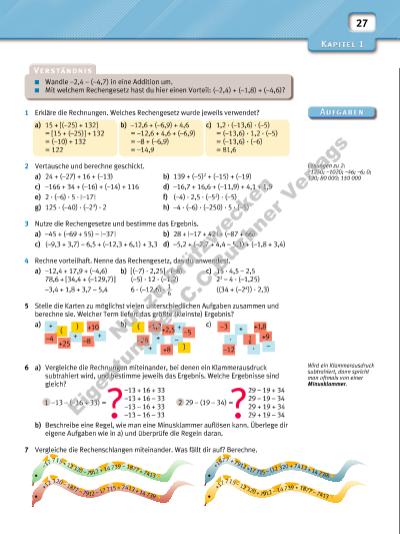 27 Wandle –2,4 – (–4,7) in eine Addition um. Mit welchem Rechengesetz hast du hier einen Vorteil: (–2,4) + (–1,8) + (–4,6)? 1 Erkläre die Rechnungen. Welches Rechengesetz wurde jeweils verwendet? a) 15 + [(–25) + 132] b) –12,6 + (–6,9) + 4,6 c) 1,2 · (–13,6) · (–5) = [15 + (–25)] + 132 = –12,6 + 4,6 + (–6,9) = (–13,6) · 1,2 · (–5) = (–10) + 132 = –8 + (–6,9) = (–13,6) · (–6) = 122 = –14,9 = 81,6 2 Vertausche und berechne geschickt. a) 24 + (–27) + 16 + (–13) b) 139 + (–5)2 + (–15) + (–19) c) –166 + 34 + (–16) + (–14) + 116 d) –16,7 + 16,6 + (–11,9) + 4,1 + 1,9 e) 2 · (–6) · 5 · | –17 | f) (–4) · 2,5 · (–52) · (–5) g) 125 · (–40) · (–23) · 2 h) –4 · (–6) · (–250) · 5 · (–5) 3 Nutze die Rechengesetze und bestimme das Ergebnis. a) –45 + (–69 + 55) – | –37 | b) 28 + | –17 + 42 | + (–87 + 66) c) (–9,3 + 3,7) – 6,5 + (–12,3 + 6,1) + 3,3 d) –5,2 + (–2,7 + 4,4 – 5,3) + (–1,8 + 3,4) 4 Rechne vorteilhaft. Nenne das Rechengesetz, das du anwendest. a) –12,4 + 17,9 + (–4,6) b) [(–7) · 2,25] · (–8) c) 15 · 4,5 – 2,5 78,6 + [34,4 + (–129,7)] (–5) · 12 · (–1,2) 22 – 4 · (–1,25) –3,4 + 1,8 + 3,7 – 5,4 6 · (–12,6) · 1 __ 6 ((34 + (–2 4)) · 2,3) 5 Stelle die Karten zu möglichst vielen unterschiedlichen Aufgaben zusammen und berechne sie. Welcher Term liefert das größte (kleinste) Ergebnis? a) b) c) 6 a) Vergleiche die Rechnungen miteinander, bei denen ein Klammerausdruck subtrahiert wird, und bestimme jeweils das Ergebnis. Welche Ergebnisse sind gleich? b) Beschreibe eine Regel, wie man eine Minusklammer aufl ösen kann. Überlege dir eigene Aufgaben wie in a) und überprüfe die Regeln daran. 7 Vergleiche die Rechenschlangen miteinander. Was fällt dir auf? Berechne. Wird ein Klammerausdruck subtrahiert, dann spricht man oftmals von einer Minusklammer. Lösungen zu 2: –1250; –1020; –46; –6; 0; 130; 80 000; 150 000 + ( –4 + + ) –8+25 +10 + ( –26 + + –5 –1,2+2,5 – +8 –3 · + +1,8 –12 +9 · – 1 6 ) –13 + 16 + 33 –13 + 16 – 33 –13 – 16 + 33 –13 – 16 – 33 1 –13 – (–16 + 33) = 29 – 19 + 34 29 – 19 – 34 29 + 19 + 34 29 + 19 – 34 2 29 – (19 – 34) = –1 7 715 + 12 320 – 7912 + 14 739 – 1877 + 7413 +1 877 + 7912 +17 715 – (1 2 320 + 7413 + 14 739) +1 2 320 – 1877 – 7912 – 17 715 + 7413 + 14 739 +1 7 715 – 12 320 + 7912 – 14 739 + 1877 – 7413 Nu r z u Pr üf zw ec ke n Ei ge nt um d es C .C .B uc hn er V er la gs | |