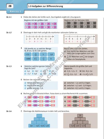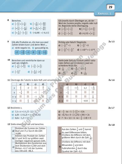 29 Zu 1.5 Zu 1.6 Zu 1.8 Gib jeweils durch Überlegen an, ob der Wert der Summe positiv, negativ oder null ist. Begründe deine Überlegung. a) ( + 2 __ 3 ) + ( – 1 __ 5 ) b) ( –1 1 __ 3 ) – ( +1 2 __ 3 ) c) ( – 2 __ 5 ) – ( + 2 __ 7 ) d) (–0,33) + ( + 1 __ 3 ) Richtig oder falsch? Begründe. a) ( – 1 __ 2 ) 10 1 b) ( – 2 __ 3 ) 5 0 c) ( – 1 __ 3 ) 3 ( – 1 __ 4 ) 4 d) (–10)10 = (–1)100 Berechne. a) ( – 1 __ 2 ) + ( + 1 __ 8 ) b) ( – 3 ___ 19 ) + ( – 16 ___ 19 ) c) ( + 2 __ 3 ) – ( – 4 ___ 18 ) d) ( + 4 ___ 13 ) + ( – 20 ___ 65 ) e) ( + 7 ___ 15 ) – ( + 1 __ 2 ) f) (–0,09) + (–0,11) Gib alle Produkte an, die man aus zwei Zahlen bilden kann und deren Wert … a) nicht negativ ist. b) ganzzahlig ist. –2 – 3 __ 2 –1 0 1 __ 2 1 1 __ 2 8 9 Stelle jede Zahl als Produkt zweier rationaler Zahlen auf mindestens zwei verschiedene Arten dar. a) 1 ___ 16 b) – 8 ___ 27 c) 1 4 __ 5 d) – 60 ____ 125 e) 48 ____ 343 f) 1 ____ 125 Berechne und vereinfache dann so weit wie möglich. a) ( – 2 __ 6 ) · ( + 6 __ 5 ) b) ( – 2 __ 5 ) · ( + 2 __ 5 ) c) ( – 1 __ 3 ) 3 d) ( – 5 ___ 12 ) · 2 2 __ 5 10 11 Übertrage die Tabelle in dein Heft und vervollständige. 13 Stelle einen Term auf und berechne. a) – 1 __ 2 · 4x – 5 · ( – 1 __ 2 ) = –12x b) –8,75x + 9 · (–1,25) + 285 = 2x c) 7 · 3x + 3,5 – 6 · 4x – 1 __ 2 · (–8) = 0 a) 7,5 + x = (–1,7) · 2,3 b) 4,05 · (–15,2) = x + (–59,31) c) 0,6x – 1,2 = 12 12 Bestimme x. Zu 1.7 a) b) c) d) x 2 __ 3 –2 4 __ 5 y – 3 __ 4 –1 – 4 __ 5 x · y –1 x : y 1 __ 2 a) b) c) d) x – 2 __ 5 –1 1 __ 3 4,1 – 4 ___ 15 y – 1 __ 3 x · y 1 __ 9 x : y 1 __ 3 –410 a) Dividiere die Summe der Zahlen 66,8 und 21,2 durch die Zahl –0,88. b) Addiere das Produkt der Zahlen 17 und 3432 zur größten zweistelligen negativen ganzen Zahl. c) Multipliziere den Quotienten aus dem Dividenden 0,289 und dem Divisor –0,17 mit der Summe aus 100 und –98,3. a) Aus den Zahlen 3 __ 4 und 4 __ 5 kannst du zwei Differenzen bilden. Dividiere die Differenz mit dem größeren Wert durch die Zahl 1 ___ 40 . b) Dividiere die Differenz mit dem Minuenden 1 __ 5 und dem Subtrahenden 3 __ 8 durch das Quadrat der Zahl –0,5. Nu r z u Pr üf zw ec ke n Ei ge nt um d es C .C .B uc hn er V er la gs | |