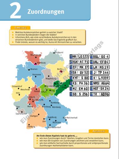 Zuordnungen2 Welches Autokennzeichen gehört zu welcher Stadt? In welchen Bundesländern liegen die Städte? Informiere dich, wie viele verschiedene Autokennzeichen es in den einzelnen Bundesländern gibt, und stelle das Ergebnis grafi sch dar. Finde Gründe, warum es wichtig ist, Autos mit Kennzeichen zu versehen. Am Ende dieses Kapitels hast du gelernt, … wie man Zuordnungen durch Tabellen, Graphen und Terme darstellen kann. wie man die Graphen von Zuordnungen zeichnen und verstehen kann. wie man einfache Sachverhalte durch proportionale und antiproportionale Zuordnungen mathematisieren kann. Stralsund Berlin Hamburg Bremen Düsseldorf Köln Frankfurt/M. Stuttgart Ulm Augsburg München NürnbergWürzburgMainz ErfurtKassel Hannover Saarbrücken Trier Meschede Bamberg Sondershausen Bad Reichenhall Marktoberdorf Jena Neumünster Magdeburg Leipzig Dresden Freiburg LimburgNu r z u Pr üf zw ec ke n Ei ge nt um d es C .C .B uc hn er V er la gs | |