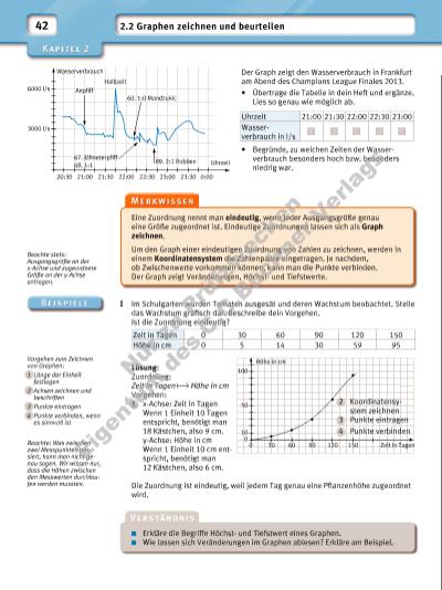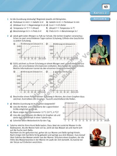 43 1 Ist die Zuordnung eindeutig? Begründe jeweils mit Beispielen. a) Parkdauer in min Gebühr in f b) Gebühr in f Parkdauer in min c) Zeitdauer in s Regenmenge in cm d) Euro US-Dollar e) Temperatur in °C Uhrzeit f) Uhrzeit Temperatur in °C g) Benzinmenge in l Preis in f h) Preis in f Benzinmenge in l 2 a) Jakob geht jeden Morgen zu Fuß zur Schule. Die beiden Graphen veranschaulichen an zwei verschiedenen Tagen seinen Schulweg. Erfi nde eine Geschichte zu jedem Schulweg. b) Güllü zeichnet zu ihrem Schulweg an einem Morgen zwei unterschiedliche Graphen, die verschiedene Informationen enthalten. Beschreibe die Unterschiede. Welche Informationen kannst du den einzelnen Graphen entnehmen? c) Beschreibe einem Partner deinen Schulweg in Worten, der einen Graphen dazu zeichnet. Kontrolliere den Graphen. Tauscht anschließend die Rollen. 3 a) Welche Zuordnung ist im Graphen dargestellt? b) Lies die Höchstund Tiefstwerte der zugeordneten Größe möglichst genau ab. c) Wann zeigte das Thermometer 12 °C (19 °C, 6 °C)? d) Lies alle zwei Stunden die Werte im Graphen ab und stelle den Sachverhalt in einer Tabelle dar. e) Schreibe einen Wetterbericht für den Tag. 4 Sabrina möchte ihren Hund Bello baden. Dazu lässt sie zunächst Wasser in die Badewanne. Als die Wanne halb voll ist, stellt sie das Wasser ab und macht sich auf die Suche nach Bello. Nachdem sie ihn gefunden hat, gehen sie zur Wanne und Bello springt hinein. Nach einiger Zeit hat Bello fertig gebadet und springt aus dem Wasser. Kurz darauf lässt Sabrina das Wasser wieder aus der Wanne. Skizziere einen Graphen, der die Höhe des Wasserstandes in der Wanne im Laufe der Zeit darstellt. Du kannst bei der Skizze auf Einheiten verzichten. 0 500 Entfernung von Zuhause in m Zeit in min 1000 20 30 40 0 1500 10 0 500 Entfernung von Zuhause in m Zeit in min 1000 20 30 40 0 1500 10 0 500 Zeit in min 1000 20 30 40 0 1500 10 2000 0 500 gelaufene Strecke in m Zeit in min 1000 20 30 40 0 1500 10 2000 1 2 1 2Entfernung von Zuhause in m 4 Uhrzeit8 10 12 0 10 6 14 16 18 20 22 24 20 Nu r z u Pr üf zw ec ke n Ei ge nt um d es C .C .B uc hn er V er la gs | |