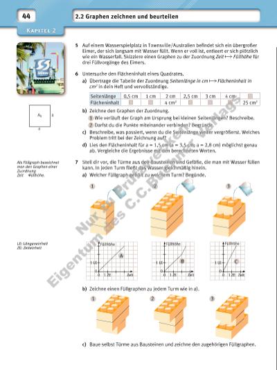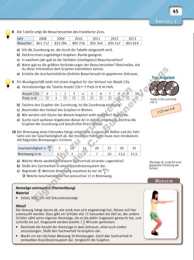 45 8 Die Tabelle zeigt die Besucherzahlen des Frankfurter Zoos. a) Gib die Zuordnung an, die durch die Tabelle dargestellt wird. b) Zeichne einen zugehörigen Graphen. Runde geeignet. c) In welchem Jahr gab es die höchsten (niedrigsten) Besucherzahlen? d) Wann gab es die größten Veränderungen der Besucherzahlen? Beschreibe, wie du diese Information dem Graphen entnehmen kannst. e) Ermittle die durchschnittliche jährliche Besucherzahl im gegebenen Zeitraum. 9 Ein Musikgeschäft wirbt mit einem Angebot für den Verkauf von Musik-CDs. a) Vervollständige die Tabelle Anzahl CDs Preis in f im Heft. b) Zeichne den Graphen der Zuordnung. Ist die Zuordnung eindeutig? c) Beschreibe den Verlauf des Graphen in Worten. d) Wie werden sich Käufer bei diesem Angebot wohl verhalten? Begründe. e) Suche nach weiteren Angeboten dieser Art in deiner Umgebung. Zeichne die Graphen der Zuordnung und beschreibe ihren Verlauf. 10 Der Bremsweg eines Fahrrades hängt neben dem Zustand der Reifen und der Fahrbahn von der Geschwindigkeit ab. Bei trockener Fahrbahn muss man mindestens mit folgenden Bremswegen rechnen: a) Welche Werte werden bei diesem Sachverhalt einander zugeordnet? b) Stelle den Sachverhalt in einem Koordinatensystem dar. c) Begründe 1 Welchen Bremsweg erwartest du bei 40 km ___ h ? 2 Welche Geschwindigkeit hat jemand bei 15 m Bremsweg. Jahr 2008 2009 2010 2011 2012 2013 Besucher 841 712 812 294 805 716 824 344 834 547 845 619 Atemzüge untersuchen (Partnerübung) Material • Zettel, Stift, Uhr mit Sekundenanzeige Ablauf Die Atmung hängt davon ab, wie stark man sich angestrengt hat. Dieses soll hier untersucht werden. Dazu gibt ein Schüler alle 15 Sekunden die Zeit an, der andere Schüler zählt seine eigenen Atemzüge, die er bis dahin insgesamt gemacht hat, und schreibt sie auf. Insgesamt werden jeweils 2 1 __ 2 Minuten gemessen. • Bestimmt die Anzahl der Atemzüge in dem Zeitraum, ohne euch vorher anzustrengen. Stellt den Sachverhalt im Graphen dar. • Macht vor der nächsten Messung 30 Kniebeugen. Stellt den Sach verhalt in demselben Koordinatensystem dar. Vergleicht die Graphen. Geschwindigkeit in km ___ h 5 10 15 20 25 30 35 Bremsweg in m 1,5 3 5 7 10 13,5 17,5 Überlege dir zunächst eine geeignete Einteilung der Achsen. Anzahl CDs 0 1 2 3 4 5 6 7 8 9 10 Preis in f 5 Top Angebot Kaufe 3 CDs zum Preis von 2! 1 CD n ur 5 f Nu r z u Pr üf zw ec ke n Ei ge nt um d es C .C .B uc hn er V er la gs | |