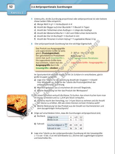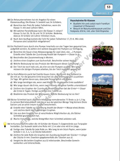 53 Pauschalreise für Klassen • Busfahrt hin und zurück nach Frankfurt (maximal 52 Personen) • Besuch im Naturkundemuseum und Zoo Festpreis: 850 f, inkl. aller Eintrittspreise 10 Ein Reiseunternehmen hat ein Angebot für einen Klassenausfl ug. Die Klasse 7c besteht aus 24 Schülern. a) Berechne den Preis für jeden Teilnehmer, wenn die Klasse 7c mit zwei Lehrern fährt. b) Mit welcher Parallelklasse kann die Klasse 7c reisen? Klasse 7a hat 29, 7b 26 und 7d 25 Schüler. Bedenke, dass je 20 Schüler ein Lehrer mitreisen muss. c) Nach dem Ausfl ug kostete die Fahrt für jeden Teilnehmer 17,35 f. Wie viele Personen sind tatsächlich mitgefahren? 11 Ein Fischteich kann durch eine Pumpe innerhalb von vier Tagen leer gepumpt bzw. aufgefüllt werden. Es stehen drei weitere (baugleiche) Pumpen zur Verfügung. a) Berechne die Dauer eines Ablassvorgangs für zwei (drei, vier, …) Pumpen. Erstelle eine Tabelle der Zuordnung Anzahl der Pumpen Dauer in d. b) Beschreibe den Zusammenhang in Worten. c) Zeichne einen Graphen zum Sachverhalt. Beschreibe seinen Verlauf. d) Welche Bedeutung hat das Produkt der Wertepaare dieser Zuordnung? e) Der Teich ist noch halb voll, als eine von vier Pumpen ausfällt. Wie lange müssen die übrigen Pumpen arbeiten, bis der Teich komplett geleert ist? 12 Zur Kartoffelernte packt bei Familie Kauss (Vater, Mutter mit drei Kindern) jeder mit an. Für die gesamte Ernte brauchen sie aller Erfahrung nach zusammen 24 Tage. Wir gehen davon aus, dass jede Person gleich viel leistet. a) Wie lange benötigen sie, wenn zwei Kinder für die gesamte Ernte ausfallen? b) Wie lange dauert die Ernte, wenn zwei Freunde die ganze Familie unterstützen? c) Zeichne den Graphen der Zuordnung Anzahl Personen bei der Ernte Dauer der Ernte in Tagen. Fertige zunächst eine Tabelle an. d) Bestimme das Produkt der Wertepaare. Welche Bedeutung hat es hier? 13 Bäcker Schmittel backt an einem Arbeitstag normalerweise 75 Brote zu je 1,5 kg. Zu seinem Betriebsjubiläum möchte er aus der gleichen Menge Teig kleinere Brote backen und an seine treuen Kunden verschenken. a) Erstelle eine Tabelle zur Zuordnung Anzahl der Brote Masse eines Brotes und zeichne damit den zugehörigen Graphen. b) Lies aus dem Graphen von a) verschiedene Möglichkeiten ab, die Bäcker Schmittel grundsätzlich hat. c) Mache Vorschläge, welche Brotgrößen Herr Schmittel anbieten soll. 14 Im Kunstunterricht sollen die 18 Schüler der Klasse 7c Gegenstände aus Tonpapier herstellen. Zur Auswahl steht eine Rolle mit 12 m oder eine mit 8 m Länge. a) Fertige eine Tabelle für jede Rolle an. Wie lang ist ein Stück Papier, wenn jeder Schüler 1 (2, 3, 4, 5, 6) Stücke bekommt? b) Zeichne für jede Rolle die Graphen der Zuordnung Anzahl der Stücke Länge der Stücke in mm. Erweitere gegebenenfalls die Tabellen aus a). c) Vergleiche die beiden Graphen aus b) miteinander. Beschreibe Gemeinsamkeiten und Unterschiede. Nu r z u Pr üf zw ck en Ei ge nt um d es C .C .B uc hn er V er la gs | |