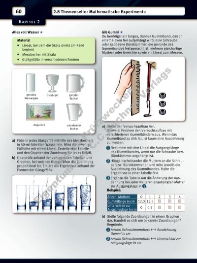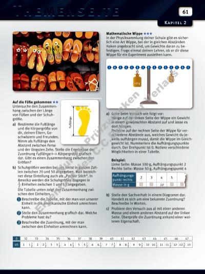 61 Mathematische Wippe In der Physiksammlung deiner Schule gibt es sicherlich eine Art Wippe, bei der in gleichen Abständen Haken angebracht sind, um Gewichte daran zu befestigen. Frage einmal deinen Lehrer, ob er dir diese Wippe für ein Experiment ausleihen kann. a) Gehe beim Versuch wie folgt vor: Hänge auf der linken Seite der Wippe ein Gewicht in einem gewünschten Abstand auf und lasse es dort hängen. Probiere auf der rechten Seite der Wippe für verschiedene Abstände aus, welches Gewicht du jeweils aufhängen musst, damit die Wippe im Gleichgewicht ist. Nummeriere die Aufhängungspunkte durch. Der Drehpunkt ist 0. Notiere verschiedene Möglichkeiten in einer Tabelle. Beispiel: Linke Seite: Masse 100 g, Aufhängungspunkt 2 Rechte Seite: Masse 50 g, Aufhängungspunkt 4 b) Stelle den Sachverhalt in einem Diagramm dar. Handelt es sich um eine bekannte Zuordnung? Beschreibe in Worten. c) Probiere den Versuch aus a) mit einer anderen Masse und einem anderen Abstand auf der linken Seite. Überprüfe die Zuordnung anhand einer weiteren Eigenschaft. Auf die Füße gekommen Untersuche den Zusammenhang zwischen der Länge von Füßen und der Schuhgröße. a) Bestimme die Fußlänge und die Körpergröße von dir, deinen Eltern, Geschwistern und Freunden. Nimm als Fußlänge den Abstand zwischen Ferse und der längsten Zehe. Stelle die Ergebnisse der Zuordnung Fußlänge Körpergröße grafisch dar. Gibt es einen Zusammenhang zwischen den Größen? b) Schuhgrößen werden bei uns meist in ganzen Zahlen zwischen 20 und 50 angegeben. Man bezeichnet diese Einteilung auch als „Pariser Stich“. In Amerika werden die Schuhgrößen dagegen in 1 __ 2 -Einheiten zwischen 1 und 13 angegeben. Die Tabelle unten zeigt den Zusammenhang zwischen den Einheiten. 1 Beschreibe die Tabelle, mit der man von unserer Einheit in die amerikanische Einheit umrechnen kann. 2 Stelle den Zusammenhang grafi sch dar. Welche Probleme hast du? 3 Beschreibe die Zuordnung, mit der man zwischen den Einheiten umrechnen kann. US 1 1 1 __ 2 2 2 1 __ 2 3 3 1 __ 2 4 4 1 __ 2 5 5 1 __ 2 6 6 1 __ 2 7 7 1 __ 2 8 8 1 __ 2 9 9 1 __ 2 10 10 1 __ 2 11 11 1 __ 2 12 12 1 __ 2 13 D 32 33 34 35 36 37 38 39 40 41 42 43 44 45 46 47 Fu ß lä ng e Aufhängungspunkt rechts 2 3 4 5 Masse in g 50 100 g 50 g 01234567 1 2 3 4 5 6 7 Nu r z u Pr üf zw ec ke n Ei g nt um d es C. C. Bu ch ne r V er la gs | |