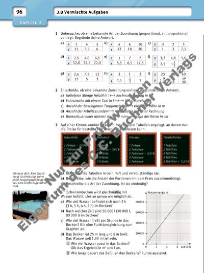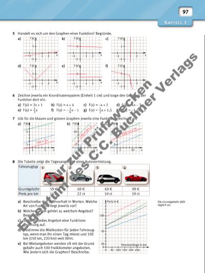 97 Die Grundgebühr fällt täglich an. 5 Handelt es sich um den Graphen einer Funktion? Begründe. a) b) c) d) e) f) 6 Zeichne jeweils ein Koordinatensystem (Einheit 1 cm) und trage den Graphen der Funktion dort ein. a) f (x) = 2x + 1 b) f (x) = x + 4 c) f (x) = –x + 2 d) f (x) = 4x – 3 e) f (x) = 1 __ 3 x f) f (x) = – 1 __ 4 x – 1 g) f (x) = 1 __ 2 x + 1,5 h) f (x) = –1,5x – 1 7 Gib für die blauen und grünen Graphen jeweils eine Funktionsgleichung an. a) b) c) 8 Die Tabelle zeigt die Tagesangebote einer Autovermietung. a) Beschreibe den Sachverhalt in Worten. Welche Art von Funktion liegt jeweils vor? b) Welcher Graph gehört zu welchem Angebot? Begründe. c) Stelle für jedes Angebot eine Funktionsgleichung auf. d) Bestimme die Mietkosten für jeden Fahrzeugtyp, wenn man ihn einen Tag mietet und 100 km (150 km, 220 km) weit fährt. e) Bei Mietangeboten werden oft mit der Grundgebühr auch 100 Freikilometer angeboten. Wie ändern sich die Graphen? Beschreibe. Fahrzeugtyp 1 2 3 4 Grundgebühr 59 f 69 f 69 f 99 f Preis pro km 14 ct 22 ct 19 ct 19 ct 2 10 5 25 x f (x) = x + 15 1 5 1 5 x f (x) = x14 f ( x) = 2x + 4 f (x) 1 5 2 10 x f (x)f (x) Preis in f 0 50 100 150 200 250 0 10 50 100 Streckenlänge in km f (x) x1–1 2 –1 1 x1–1 2 –1 1 f (x) x1–1 2 –1 1 f (x) x1–1 2 –1 1 f (x) x1–1 2 –1 1 f (x) x1–1 2 –1 1 f (x) Nu r z ur P rü fzw ec ke n Ei g nt um d es C .C . B uc hn er V er la gs | |