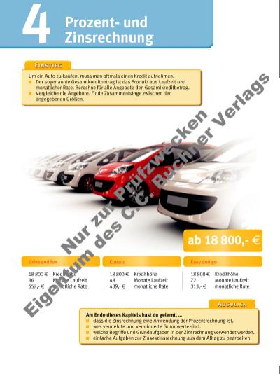 4 Prozentund Zinsrechnung Um ein Auto zu kaufen, muss man oftmals einen Kredit aufnehmen. Der sogenannte Gesamtkreditbetrag ist das Produkt aus Laufzeit und monatlicher Rate. Berechne für alle Angebote den Gesamtkreditbetrag. Vergleiche die Angebote. Finde Zusammenhänge zwischen den angegebenen Größen. Am Ende dieses Kapitels hast du gelernt, … dass die Zinsrechnung eine Anwendung der Prozentrechnung ist. was vermehrte und verminderte Grundwerte sind. welche Begriffe und Grundaufgaben in der Zinsrechnung verwendet werden. einfache Aufgaben zur Zinseszinsrechnung aus dem Alltag zu bearbeiten. ab 18 800,f Drive and fun 18 800 f Kredithöhe 36 Monate Laufzeit 557,f monatliche Rate Classic 18 800 f Kredithöhe 48 Monate Laufzeit 439,f monatliche Rate Easy and go 18 800 f Kredithöhe 72 Monate Laufzeit 313,f monatliche Rate Nu r z ur P rü fzw ec ke n Ei ge tu m d es C .C . B uc hn er V er la gs | |