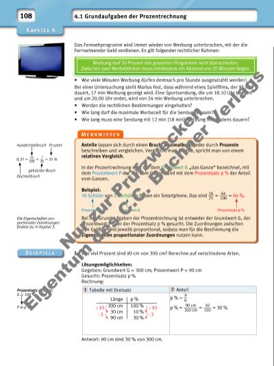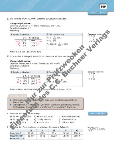 109 II Wie viel sind 3 % von 1200 f? Berechne auf verschiedene Arten. Lösungsmöglichkeiten: Gegeben: Grundwert G = 1200 f; Prozentsatz p % = 3 % Gesucht: Prozentwert P Rechnung: Antwort: 3 % von 1200 f sind 36 f. III 60 % sind 84 f. Wie groß ist das Ganze? Berechne auf verschiedene Arten. Lösungsmöglichkeiten: Gegeben: Prozentwert P = 84 f; Prozentsatz p % = 60 % Gesucht: Grundwert G Rechnung: Antwort: Wenn 60 % 84 f sind, dann entsprechen dem Ganzen 140 f. 1 Berechne den Prozentsatz im Kopf. a) 27 von 100 Mädchen b) 66 von 200 Autos c) 90 von 300 Bonbons d) 56 kg von 800 kg e) 250 kg von 0,75 t f) 30 cm von 20 cm g) 90 min von 2 h h) 6 m von 10 m i) 17 h von 51 h 2 Berechne den Prozentsatz auf verschiedene Arten wie in Beispiel I. Die Angabe eines Anteils in Prozent ist genauer als die Angabe als Bruch. Stimmt das? Gilt folgender Zusammenhang? „Wenn der Grundwert gleich bleibt, dann ist der Prozentwert umso größer, je größer der Prozentsatz ist.“ Begründe. 1 Tabelle mit Dreisatz 2 Teil vom Ganzen P = G · p ____ 100 bzw. P = G · p % P = 1200 f · 3 ____ 100 = 36 f Geldbetragp % : 100100 % 1 % 3 % 1200 f 12 f 36 f : 100 · 3 · 3 1 Tabelle mit Dreisatz 2 Vom Teil zum Ganzen G = P · 100 ____ p bzw. G = P : p % G = 84 f · 100 ____ 60 = 140 f Geldbetragp % : 660 % 10 % 100 % 84 f 14 f 140 f : 6 · 10 · 10 Grundwert bestimmen: p % P 100 % G Prozentwert bestimmen: 100 % G p % P a) b) c) d) e) Grundwert G 78 min 475 kg 80 m 26,50 l 9200 f Prozentwert P 39 min 76 kg 13,6 m 12,72 l 9660 f Prozentsatz p % Lösungen zu 2: 16 %; 17 %; 48 %; 50 %; 105 % Nu r z ur P rü fzw ec ke n Ei ge n um d es C .C . B uc hn er V er la gs | |