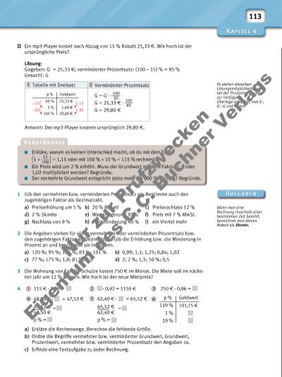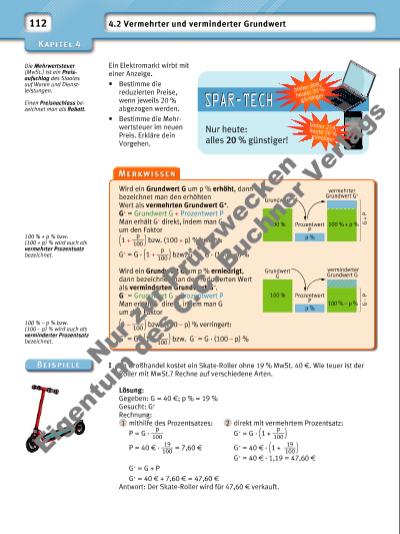113 1 Gib den vermehrten bzw. verminderten Prozentsatz an. Bestimme auch den zugehörigen Faktor als Dezimalzahl. a) Preiserhöhung um 5 % b) 20 % Rabatt c) Preisnachlass 12 % d) 2 % Skonto e) Wertsteigerung 30 % f) Preis mit 7 % MwSt. g) Nachlass von 9 % h) Preisminderung 40 % i) ein Viertel mehr 2 Die Angaben stehen für einen vermehrten oder verminderten Prozentsatz bzw. den zugehörigen Faktor als Dezimalzahl. Gib die Erhöhung bzw. die Minderung in Prozent an und beschreibe sie in Worten. a) 120 %; 95 %; 104 %; 83 %; 101 % b) 0,99; 1,1; 1,25; 0,84; 1,02 c) 77 %; 175 %; 1,8; 81 %; 0,9 d) 2; 2 %; 1,5; 50 %; 0,5 3 Die Wohnung von Familie Schulze kostet 750 f im Monat. Die Miete soll im nächsten Jahr um 12 % steigen. Wie hoch ist der neue Mietpreis? 4 a) Erkläre die Rechenwege. Berechne die fehlende Größe. b) Ordne die Begriffe vermehrter bzw. verminderter Grundwert, Grundwert, Prozentwert, vermehrter bzw. verminderter Prozentsatz den Angaben zu. c) Erfi nde eine Textaufgabe zu jeder Rechnung. Erkläre, warum es keinen Unterschied macht, ob du mit dem Faktor ( 1 + 15 ____ 100 ) = 1,15 oder mit 100 % + 15 % = 115 % rechnest. Ein Preis wird um 2 % erhöht. Muss der Grundwert mit dem Faktor 1,2 oder 1,02 multipliziert werden? Begründe. Der vermehrte Grundwert entspricht stets mehr als 100 %. Richtig? Begründe. Es stehen dieselben Lösungsmöglichkeiten wie bei der Prozentrechnung zur Verfügung. Überlege zunächst, was G+, G–, G und P sind. Wenn man eine Rechnung innerhalb einer bestimmten Zeit bezahlt, bezeichnet man diesen Rabatt als Skonto. 1 115 f · 1,08 = 2 · 0,92 = 1150 f 3 250 f · 0,86 = 4 48,50 f · = 47,53 f 5 62,40 f · = 65,52 f 6 Geldwertp % 119 % 1 % 19 % 101,15 f47,53 f 48,50 f = p % = 65,52 f 62,40 f = p % = II Ein mp3-Player kostet nach Abzug von 15 % Rabatt 25,33 f. Wie hoch ist der ursprüngliche Preis? Lösung: Gegeben: G– = 25,33 f; verminderter Prozentsatz: (100 – 15) % = 85 % Gesucht: G Antwort: Der mp3-Player kostete ursprünglich 29,80 f. 1 Tabelle mit Dreisatz 2 Verminderter Prozentsatz Geldwertp % : 1785 % 5 % 100 % 25,33 f 1,49 f 29,80 f : 17 · 20 · 20 G = G– · 100 ___ 85 G = 25,33 f · 100 ___ 85 G = 29,80 f Nu r z ur Pr üf zw ec ke n Ei ge nt um d s C .C . B uc hn er V er la s | |