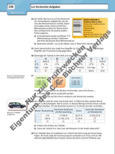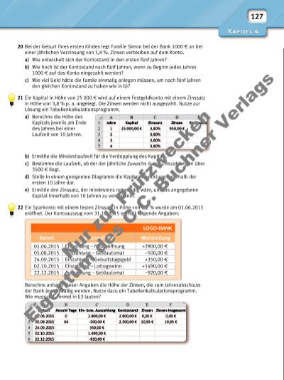 127 20 Bei der Geburt ihres ersten Kindes legt Familie Simon bei der Bank 1000 f an bei einer jährlichen Verzinsung von 1,8 %. Zinsen verbleiben auf dem Konto. a) Wie entwickelt sich der Kontostand in den ersten fünf Jahren? b) Wie hoch ist der Kontostand nach fünf Jahren, wenn zu Beginn jedes Jahres 1000 f auf das Konto eingezahlt werden? c) Wie viel Geld hätte die Famlie einmalig anlegen müssen, um nach fünf Jahren den gleichen Kontostand zu haben wie in b)? 21 Ein Kapital in Höhe von 25 000 f wird auf einem Festgeldkonto mit einem Zinssatz in Höhe von 3,8 % p. a. angelegt. Die Zinsen werden nicht ausgezahlt. Nutze zur Lösung ein Tabellenkalkulationsprogramm. a) Berechne die Höhe des Kapitals jeweils am Ende des Jahres bei einer Laufzeit von 10 Jahren. b) Ermittle die Mindestlaufzeit für die Verdopplung des Kapitals. c) Bestimme die Laufzeit, ab der der jährliche Zuwachs durch Zinszahlungen über 3500 f liegt. d) Stelle in einem geeigneten Diagramm die Kapitalentwicklung innerhalb der ersten 10 Jahre dar. e) Ermittle den Zinssatz, der mindestens notwendig wäre, um das angegebene Kapital innerhalb von 10 Jahren zu verdoppeln. 22 Ein Sparkonto mit einem festen Zinssatz in Höhe von 2,2 % wurde am 01.06.2015 eröffnet. Der Kontoauszug vom 31.12.2015 enthält folgende Angaben: Berechne anhand dieser Angaben die Höhe der Zinsen, die zum Jahresabschluss der Bank jeweils fällig werden. Nutze dazu ein Tabellenkalkulationsprogramm. Wie muss die Formel in E3 lauten? Datum Beschreibung Wertstellung 01.06.2015 Einzahlung – Neueröffnung +2800,00 f 05.08.2015 Auszahlung – Geldautomat –500,00 f 24.09.2015 Einzahlung – Geburtstagsgeld +350,00 f 02.10.2015 Einzahlung – Lottogewinn +1490,00 f 22.12.2015 Auszahlung – Geldautomat –920,00 f LOGO-BANK N r z ur Pr üf zw ec ke n Ei ge nt um es C .C . B uc hn er V er la gs | |
