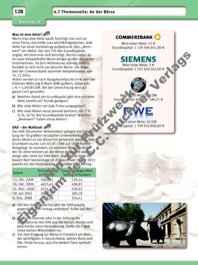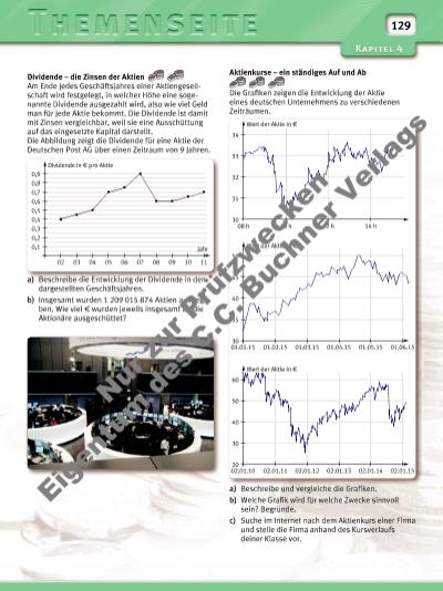 129 Aktienkurse – ein ständiges Auf und Ab Die Grafi ken zeigen die Entwicklung der Aktie eines deutschen Unternehmens zu verschiedenen Zeiträumen. a) Beschreibe und vergleiche die Grafi ken. b) Welche Grafi k wird für welche Zwecke sinnvoll sein? Begründe. c) Suche im Internet nach dem Aktienkurs einer Firma und stelle die Firma anhand des Kursverlaufs deiner Klasse vor. Dividende – die Zinsen der Aktien Am Ende jedes Geschäftsjahres einer Aktiengesellschaft wird festgelegt, in welcher Höhe eine sogenannte Dividende ausgezahlt wird, also wie viel Geld man für jede Aktie bekommt. Die Dividende ist damit mit Zinsen vergleichbar, weil sie eine Ausschüttung auf das eingesetzte Kapital darstellt. Die Abbildung zeigt die Dividende für eine Aktie der Deutschen Post AG über einen Zeitraum von 9 Jahren. a) Beschreibe die Entwicklung der Dividende in den dargestellten Geschäftsjahren. b) Insgesamt wurden 1 209 015 874 Aktien ausgegeben. Wie viel f wurden jeweils insgesamt an die Aktionäre ausgeschüttet? 02 Dividende in f pro Aktie 0,1 0,2 0,3 0,4 0,5 0,6 0,7 0,8 0,9 03 04 05 06 07 08 09 10 11 Jahr 08 h 30 31 32 33 34 10 h Wert der Aktie in f 12 h 14 h 01.01.15 01.02.15 01.03.15 01.04.15 01.05.15 01.06.15 30 35 40 45 50 Wert der Aktie in f 02.01.10 02.01.11 02.01.12 02.01.13 02.01.14 02.01.15 20 30 40 50 60 Wert der Aktie in f Nu r z ur P rü fzw ck en Ei ge nt um d es C .C . B uc hn er V er la gs | |