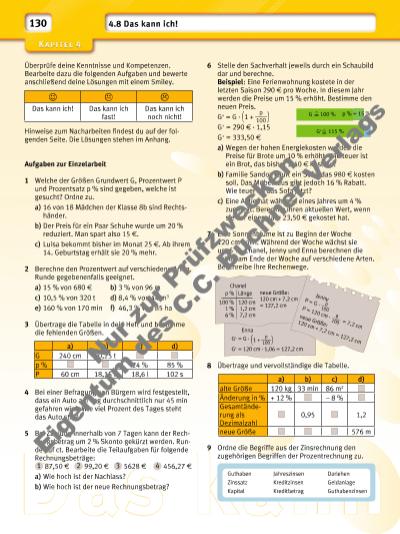 Das kann ich! 131 Aufgaben für Lernpartner Arbeitsschritte 1 Bearbeite die folgenden Aufgaben alleine. 2 Suche dir einen Partner und erkläre ihm deine Lösungen. Höre aufmerksam und gewissenhaft zu, wenn dein Partner dir seine Lösungen erklärt. 3 Korrigiere gegebenenfalls deine Antworten und benutze dazu eine andere Farbe. Sind folgende Behauptungen richtig oder falsch? Begründe schriftlich. 18 Der Grundwert entspricht einem Prozentwert von 100 %. 19 Die Grundaufgaben der Prozentrechnung lassen sich auf die verschiedenen Arten wie eine proportionale Zuordnung lösen. 20 Beim vermehrten Grundwert gilt: G+ = G – P 21 Wenn ein Preis um 20 % reduziert wurde, dann ist der neue Preis 80 % des alten Preises. 22 Die Jahreszinsen entsprechen dem Grundwert bei der Prozentrechnung. 23 Wird ein Kapital von 200 f mit 2 % verzinst, dann erhält man nach einem Jahr 2 f Zinsen. 24 Wird Geld nur einen Teil des Jahres angelegt, dann wird auch nur der zugehörige Anteil der Jahreszinsen Z ausgeschüttet. Aufgabe Ich kann … Hilfe 1, 18 die Grundbegriffe der Prozentrechnung zuordnen. S. 108 2, 3, 4, 19 die Grundaufgaben der Prozentrechnung auf verschiedene Arten lösen. S. 108 5, 6, 7, 8, 20, 21 den vermehrten und verminderten Grundwert bestimmen. S. 112 9, 22 die Zinsrechnung als eine Anwendung der Prozentrechnung auffassen. S. 116 10, 11, 23 die Grundaufgaben der Zinsrechnung bearbeiten. S. 116 12, 13, 24 Zinsen auch nur für einen Teil des Jahres bestimmen. S. 116 14, 15 Zinsen bei Ratenzahlungen innerhalb eines Jahres bestimmen. S. 119 16, 17 einfache Aufgaben der Zinseszinsrechnung lösen. S. 118 10 Berechne die fehlenden Werte. 11 a) Frau Bons hat ein Darlehen aufgenommen und muss bei 7,5 % im Jahr 405 f Zinsen bezahlen. Wie hoch ist das Darlehen? b) Auf einem Sparbuch liegen 640 f, die mit 2 % im Jahr verzinst werden. Welche Zinsen werden am Jahresende gutgeschrieben? c) Zu welchem Zinssatz wurde ein Guthaben angelegt, wenn 1200 f in einem Jahr 30 f Zinsen bringen? 12 Frau Fischer hat ihr Girokonto 30 Tage lang um 350 f überzogen. Welche Zinsen werden ihr bei 12 % Überziehungszins dafür berechnet? 13 Berechne die fehlenden Größen im Heft. Runde gegebenenfalls geeignet. 14 Herr Müller zahlt in einen neu angelegten Bausparvertrag zu Beginn eines Quartals jeweils 80 f ein. Um welchen Betrag erhöht sich der Vertragswert im ersten Jahr, wenn ein Zinssatz von 2 % zugrunde gelegt wird? 15 Vergleiche die Zinsen, die nach einem Jahr gutgeschrieben werden, wenn jemand … a) zu Beginn b) am Ende eines Quartals jeweils 130 f bei einem Zinssatz von 3,5 % auf ein Sparkonto einzahlt, das zuvor leer war. 16 1000 f (2500 f) werden zu 3 % pro Jahr angelegt. Dabei werden die Zinsen jeweils mitverzinst. Bestimme jeweils den Kontostand am Ende jedes Jahres, wenn das Geld vier Jahre angelegt wird. 17 Aus 500 f werden nach 2 Jahren 561,80 f, wenn die Zinsen jeweils mitverzinst wurden. Wie hoch ist der Zinssatz? Probiere aus. a) b) c) d) e) K 460 f 1200 f 245 f p % 4 % 6,5 % 6 % 3,5 % Z 4,90 f 46,80 f 126 f a) b) c) d) K 2500 f 680 f 1400 f 1800 f p % 6 % 4 % 3 % Zeit 4 Monate 8 Monate 120 Tage Z 10,50 f 24 f Nu r z ur P rü fzw ck en Ei ge tu d es C .C . B uc hn er V er la gs | |