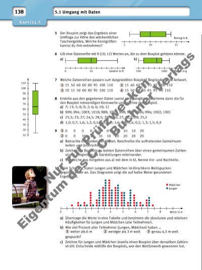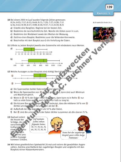 139 1 2 10 Bei einem 2000-m-Lauf wurden folgende Zeiten gemessen: 8:24; 9:03; 7:57; 8:12; 8:49; 8:11; 7:20; 7:27; 9:28; 7:51 6:36; 9:42; 8:39; 8:17; 9:08; 8:18; 9:37; 7:12; 8:39; 8:21 a) Erstelle eine Rangliste. Beginne bei der besten Zeit. b) Bestimme die durchschnittliche Zeit. Wandle die Zeiten zuvor in s um. c) Bestimme den Modalwert sowie den Median der Messung. d) Zeichne einen Boxplot. Bestimme zuvor die fehlenden Kennwerte. e) Beschreibe mit dem Boxplot aus d) die Verteilung der Daten. 11 Erfi nde zu jedem Boxplot jeweils eine Datenreihe mit mindestens neun Werten. a) b) 12 Welche Aussagen zu den Boxplots sind richtig? Berichtige falsche Aussagen. a) Die Spannweiten beider Datenreihen sind gleich groß. b) Wenn die Spannweiten von 1 und 2 gleich sind, dann sind auch Minimum und Maximum gleich. c) Wenn in 2 50 % der Daten in der Box liegen, dann kann es in Reihe 1 nur halb so viele Daten geben, weil die Box nur halb so lang ist. d) Die kürzere Box von 1 gegenüber 2 bedeutet, dass die mittleren 50 % von 1 dichter um den Median herum liegen als bei 2 . e) Außerhalb der Box liegen mehr als 50 % aller Daten. f) Bei 2 sind die unteren 25 % der Daten dichter zusammen als die oberen 25 %. 13 Raphael notiert die Anzahl der Schläge, die zehn verschiedene Golfspieler auf einer Runde (Par 72) benötigen. Wie könnte Jana zu ihrer Aussage kommen? Erkläre. 14 Wirf einen gewöhnlichen Spielwürfel 20-mal und notiere die gewürfelten Augenzahlen. Zeichne anschließend den zugehörigen Boxplot und vergleiche mit den Boxplots deiner Klassenkameraden. 8:24 steht für 8 min 24 s. 0 10 20 30 40 50 60 70 80 90 100110 400 500 600 700 800 900 1000 1100 Auf meinem Zettel stehen folgende Daten: 78, 77, 79, 93, 76, 64, 79, 77, 78, 76. Dann hat der zugehörige Boxplot ganz schön lange Antennen! Nu r z ur P rü fzw ec ke n Ei en tu m d es C .C . B uc hn er V er la gs | |