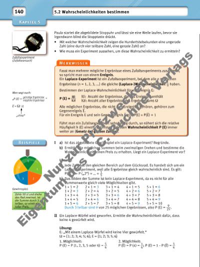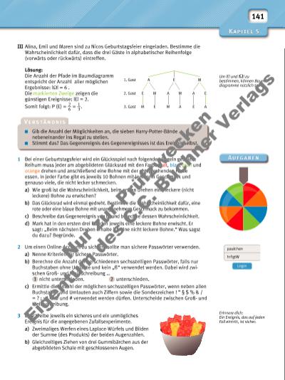 141 Um |E| und |Ω| zu bestimmen, können Baumdiagramme nützlich sein. Erinnere dich: Ein Ereignis, das auf jeden Fall eintritt, ist sicher. III Alina, Emil und Maren sind zu Nicos Geburtstagsfeier eingeladen. Bestimme die Wahrscheinlichkeit dafür, dass die drei Gäste in alphabetischer Reihenfolge (vorwärts oder rückwärts) eintreffen. Lösung: Die Anzahl der Pfade im Baumdiagramm entspricht der Anzahl aller möglichen Ergebnisse: |Ω| = 6 . Die markierten Zweige zeigen die günstigen Ereignisse: |E| = 2. Somit folgt: P (E) = 2 __ 6 = 1 __ 3 . A1. Gast E M A A A AE2. Gast E EE MM M3. Gast M Gib die Anzahl der Möglichkeiten an, die sieben Harry-Potter-Bände nebeneinander ins Regal zu stellen. Stimmt das? Das Gegenereignis des Gegenereignisses ist das Ereignis selbst. 1 Bei einer Geburtstagsfeier wird ein Glücksspiel nach folgenden Regeln gespielt: Reihum muss jeder am abgebildeten Glücksrad mit den Farben rot, blau, grün und orange drehen und anschließend eine Bohne mit der entsprechenden Farbe essen. In jeder Farbe gibt es jeweils 10 Bohnen mit leckerem Geschmack und genauso viele, die nicht lecker schmecken. a) Wie groß ist die Wahrscheinlichkeit, beim ersten Drehen eine leckere (nicht leckere) Bohne zu erwischen? b) Das Glücksrad wird einmal gedreht. Bestimme die Wahrscheinlichkeit dafür, eine rote oder eine blaue Bohne mit unangenehmem Geschmack zu bekommen. c) Beschreibe das Gegenereignis von b) und berechne dessen Wahrscheinlichkeit. d) Mark hat in den ersten drei Runden jeweils eine leckere Bohne erwischt. Er sagt: „Beim nächsten Drehen erhalte ich eine nicht leckere Bohne.“ Was sagst du dazu? Begründe. 2 Um einen Online-Account zu sichern, sollte man sichere Passwörter verwenden. a) Nenne Kriterien für sichere Passwörter. b) Berechne die Anzahl der verschiedenen sechsstelligen Passwörter, falls nur Buchstaben ohne Umlaute und kein „ß“ verwendet werden. Dabei wird zwischen Großund Kleinschreibung … 1 nicht unterschieden. 2 unterschieden. c) Ermittle die Anzahl der möglichen sechsstelligen Passwörter, wenn neben allen Buchstaben und Umlauten auch Ziffern sowie die Sonderzeichen ! ” § $ % & / = ? ; : * f @ und # verwendet werden dürfen. Unterscheide zwischen Großund Kleinschreibung. 3 Beschreibe jeweils ein sicheres und ein unmögliches Ereignis für die angegebenen Zufallsexperimente. a) Zweimaliges Werfen eines Laplace-Würfels und Bilden der Summe (des Produkts) der beiden Augenzahlen. b) Gleichzeitiges Ziehen von drei Gummibärchen aus der abgebildeten Schale mit geschlossenen Augen. hrFgtW paulchen Login Nu r z ur P rü fzw ck en Ei ge tu m d es C .C . B uc hn er V er la gs | |