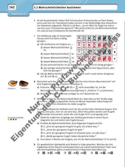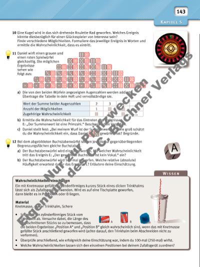 143 10 Eine Kugel wird in das sich drehende Roulette-Rad geworfen. Welches Ereignis könnte diesbezüglich für einen Glücksspieler von Interesse sein? Finde verschiedene Möglichkeiten. Formuliere das jeweilige Ereignis in Worten und ermittle die Wahrscheinlichkeit, dass es eintritt. 11 Daniel wirft einen grauen und einen roten Spielwürfel gleichzeitig. Die möglichen Ergebnisse sehen wie folgt aus: a) Die von den beiden Würfeln angezeigten Augenzahlen werden addiert. Übertrage die Tabelle in dein Heft und vervollständige sie. b) Ermittle die Wahrscheinlichkeit für das Eintreten des Ereignisses E: „Der Summenwert ist eine Primzahl.“ Beschreibe dein Vorgehen. c) Daniel stellt fest: „Bei meinem Wurf ist der Summenwert 10.“ Wie groß schätzt du die Wahrscheinlichkeit ein, dass Daniel gewürfelt hat? Begründe. 12 Bei dem abgebildeten Buchstabenwürfel stehen jeweils auf gegenüberliegenden Begrenzungsfl ächen gleiche Buchstaben. a) Der Buchstabenwürfel wird einmal geworfen. Mit welcher Wahrscheinlichkeit tritt das Ereignis E: „Der geworfene Buchstabe ist kein Vokal.“ ein? b) Der Buchstabenwürfel wird 500-mal geworfen. Welche relative (absolute) Häufi gkeit erwartest du für das Ergebnis L? Erläutere deine Einschätzung. Wahrscheinlichkeiten einschätzen Ein mit Knetmasse gefülltes zylinderförmiges kurzes Stück eines dicken Trinkhalms lässt sich als Zufallsgerät verwenden. Wird es auf eine Tischplatte geworfen, dann bleibt es in Position A oder B liegen. Material Knetmasse, dicker Trinkhalm, Schere • Schneide ein zylinderförmiges Stück vom Trinkhalm ab. Versuche dabei, die Länge des abgeschnittenen Stücks so zu bemessen, dass die beiden Ergebnisse „Position A“ und „Position B“ gleich wahrscheinlich sind, wenn das mit Knetmasse gefüllte Stück anschließend geworfen wird (achte darauf, den Trinkhalm beim Abschneiden nicht zu verformen). • Überprüfe anschließend, wie erfolgreich deine Einschätzung war, indem du 100-mal (250-mal) wirfst. • Welche Wahrscheinlichkeiten lassen sich den einzelnen Positionen bei deinem Zufallsgerät zuordnen? Wert der Summe beider Augenzahlen 2 3 4 … Anzahl der Möglichkeiten 1 … Zugehörige Wahrscheinlichkeit … A B Nu r z ur P rü fzw ec ke n Ei ge nt um d e C .C . B uc hn er V er la gs | |