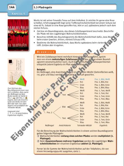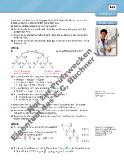 145 I Ein Schmerzmittel wirkt erfahrungsgemäß in 80 % aller Fälle. Ein Arzt verschreibt dieses Medikament drei Patienten zum ersten Mal. a) Zeichne ein Baumdiagramm zum Sachverhalt. b) Bestimme die Wahrscheinlichkeit, dass das Medikament bei genau zwei der Betroffenen wirkt. c) Berechne die Wahrscheinlichkeit dafür, dass das Medikament bei niemandem Wirkung zeigt. d) Bestimme die Wahrscheinlichkeit, dass das Medikament bei mindestens einem Patienten wirkt. Lösung: a) W: „Das Medikament wirkt.“ b) P („Medikament wirkt bei genau zwei Patienten.“): rote Pfade in a) P (WW __ W) + P (W __ WW) + P ( __ WWW) = 0,8 · 0,8 · 0,2 + 0,8 · 0,2 · 0,8 + 0,2 · 0,8 · 0,8 = 3 · 0,82 · 0,2 = 0,384 = 38,4 % c) P („Medikament wirkt bei niemandem.“): blauer Pfad in a) P ( __ W __ W __ W) = 0,2 · 0,2 · 0,2 = 0,23 = 0,008 = 0,8 % d) P („Medikament wirkt bei mindestens einem Patienten.“) = 1 – P („Medikament wirkt bei niemandem.“) = 1 – 0,008 = 0,992 = 99,2 % II In einer Klasse mit 30 Schülern wird jede Woche ein Schüler für den Tafeldienst ausgelost. Wer einmal Tafeldienst hatte, wird von der Liste gestrichen. a) Bestimme die Wahrscheinlichkeit, dass Simon in der dritten Woche Tafeldienst hat. Zeichne ein zugehöriges Baumdiagramm. b) Berechne die Wahrscheinlichkeit dafür, dass Simon spätestens in der dritten Woche Tafeldienst hat. Lösung: a) S: „Simon wird für den Tafeldienst ausgelost.“ P („Simon wird in der 3. Woche ausgelost.“): roter Pfad im Baumdiagramm P ( __ S __ S S) = 29 ___ 30 · 28 ___ 29 · 1 ___ 28 = 1 ___ 30 = 0,0 __ 3 3 % b) P („Simon ist spätestens in der 3. Woche dran.“): blaue Pfade im Baumdiagramm P (S) + P ( __ S S) + P ( __ S __ S S) = 1 ___ 30 + 29 ___ 30 · 1 ___ 29 + 1 ___ 30 = 1 ___ 10 = 0,1 = 10 % Denke an die Gegenwahrscheinlichkeit: P(E) + P( __ E) = 1 Wenn Simon Tafeldienst hatte, kann der Pfad enden. Es ist unmöglich, dass er beim nächsten Mal gezogen wird. W W Pfad für keine Wirkung bei einem Patienten Pfade für Wirkung bei genau zwei Patienten 0,8 0,2 0,8 0,2 0,8 0,2 0,8 0,2 0,8 0,2 0,8 0,2 0,8 0,2 W W WW W W W W WW W W S 1. Woche 2. Woche 3. Woche S S S S S 1 30 29 30 28 29 27 28 1 28 1 29 Nu zu r P rü fzw ec ke n Ei ge nt um d s C .C . B uc hn er V er la gs | |