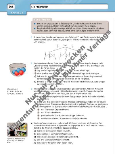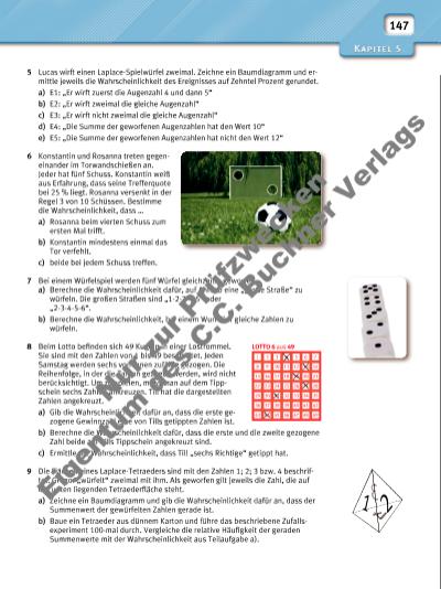 147 5 Lucas wirft einen Laplace-Spielwürfel zweimal. Zeichne ein Baumdiagramm und ermittle jeweils die Wahrscheinlichkeit des Ereignisses auf Zehntel Prozent gerundet. a) E1: „Er wirft zuerst die Augenzahl 4 und dann 5“ b) E2: „Er wirft zweimal die gleiche Augenzahl“ c) E3: „Er wirft nicht zweimal die gleiche Augenzahl“ d) E4: „Die Summe der geworfenen Augenzahlen hat den Wert 10“ e) E5: „Die Summe der geworfenen Augenzahlen hat nicht den Wert 12“ 6 Konstantin und Rosanna treten gegeneinander im Torwandschießen an. Jeder hat fünf Schuss. Konstantin weiß aus Erfahrung, dass seine Trefferquote bei 25 % liegt. Rosanna versenkt in der Regel 3 von 10 Schüssen. Bestimme die Wahrscheinlichkeit, dass … a) Rosanna beim vierten Schuss zum ersten Mal trifft. b) Konstantin mindestens einmal das Tor verfehlt. c) beide bei jedem Schuss treffen. 7 Bei einem Würfelspiel werden fünf Würfel gleichzeitig geworfen. a) Berechne die Wahrscheinlichkeit dafür, auf Anhieb eine „große Straße“ zu würfeln. Die großen Straßen sind „1-2-3-4-5“ oder „2-3-4-5-6“. b) Berechne die Wahrscheinlichkeit, bei einem Wurf fünf gleiche Zahlen zu würfeln. 8 Beim Lotto befi nden sich 49 Kugeln in einer Lostrommel. Sie sind mit den Zahlen von 1 bis 49 beschriftet. Jeden Samstag werden sechs von ihnen zufällig gezogen. Die Reihenfolge, in der die Zahlen gezogen werden, wird nicht berücksichtigt. Um zu spielen, muss man auf dem Tippschein sechs Zahlen ankreuzen. Till hat die dargestellten Zahlen angekreuzt. a) Gib die Wahrscheinlichkeit dafür an, dass die erste gezogene Gewinnzahl eine von Tills getippten Zahlen ist. b) Berechne die Wahrscheinlichkeit dafür, dass die erste und die zweite gezogene Zahl beide auf Tills Tippschein angekreuzt sind. c) Ermittle die Wahrscheinlichkeit, dass Till „sechs Richtige“ getippt hat. 9 Die Flächen eines Laplace-Tetraeders sind mit den Zahlen 1; 2; 3 bzw. 4 beschriftet. Gregor „würfelt“ zweimal mit ihm. Als geworfen gilt jeweils die Zahl, die auf der unten liegenden Tetraederfl äche steht. a) Zeichne ein Baumdiagramm und gib die Wahrscheinlichkeit dafür an, dass der Summenwert der gewürfelten Zahlen gerade ist. b) Baue ein Tetraeder aus dünnem Karton und führe das beschriebene Zufallsexperiment 100-mal durch. Vergleiche die relative Häufi gkeit der geraden Summenwerte mit der Wahrscheinlichkeit aus Teilaufgabe a). LOTTO 6 aus 49 49 42414039383736 35343332313029 28272625242322 21201918171615 141312111098 7654321 484746454443 Nu r z ur P rü fzw ec ke n Ei ge nt um d es C .C . B uc hn er V er la gs | |