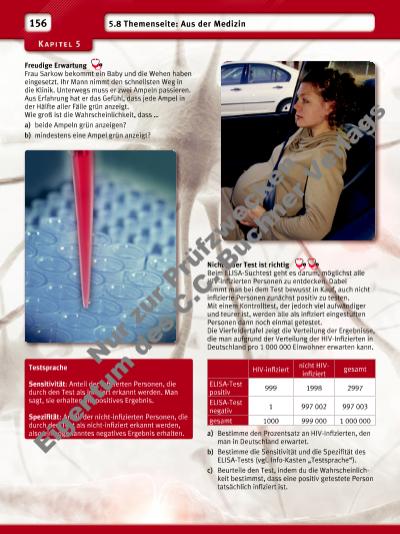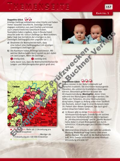 157 Ungebetene Gäste Zecken können in der Natur unbemerkt auf Menschen krabbeln. Sie sind kleine blutsaugende Parasiten, die zahlreiche Krankheiten übertragen können. Besonders gefährlich ist dabei die Hirnhautentzündung (Meningitis), deren Viren während des Blutsaugens übertragen werden. Die Hälfte aller Patienten, die eine Hirnhautentzündung haben, klagen zu Anfang unter einer Steifheit des Nackens. Jedoch klagt in einer Arztpraxis jeder 20. Patient über dieses Symptom, das auch ganz andere Ursachen haben kann. a) In Hessen gibt es einige Risikogebiete für Hirnhautentzündungen. Erstelle für ein solches Gebiet eine Vierfeldertafel mit den Ereignissen H: „Hirnhauteinzündung“ und N: „steifer Nacken“. Gehe dabei in einem Risikogebiet von durchschnittlich 3 Erkrankungen pro 100 000 Einwohnern aus. b) Während eines Urlaubs an der Lahn im Landkreis Marburg-Biedenkopf klagt Svenja über einen steifen Nacken. Wie groß ist die Wahrscheinlichkeit, dass Svenja tatsächlich an einer Hirnhautentzündung erkrankt ist? Doppeltes Glück Eineiige Zwillinge entstammen einer Eizelle und haben immer dasselbe Geschlecht. Zweieiige Zwillinge dagegen entstehen aus zwei Eizellen und können auch unterschiedliches Geschlecht haben. Statistiken haben ergeben, dass in Deutschland etwa bei jeder 60. Geburt Zwillinge zur Welt kommen. Dabei liegt das Verhältnis der eineiigen zu den zweieiigen Zwillingsgeburten ungefähr bei 1 : 2. a) Bestimme die Wahrscheinlichkeit, dass eine Geburt eine Zwillingsgeburt mit eineiigen (zweieiigen) Zwillingen ist. b) Die Nachbarn haben Zwillinge bekommen. Mit welcher Wahrscheinlichkeit handelt es sich dabei um zwei Jungen, wenn die Zwillinge … 1 eineiig sind. 2 zweieiig sind. Gehe davon aus, dass die Wahrscheinlichkeiten für Jungenund Mädchengeburten gleich groß sind. Risikogebiet: Mehr als 1 Erkrankung pro 100 000 Einwohner vereinzelt auftretende Fälle: Weniger als 1 Erkrankung pro 100 000 Einwohner keine aufgetretenen Fälle Nu r z ur P rü fzw ec ke n Ei ge nt um d es C .C . B uc hn er V er la gs | |
