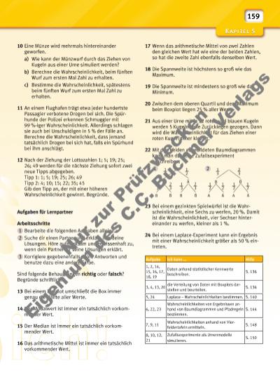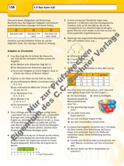 Das kann ich! 159 10 Eine Münze wird mehrmals hintereinander geworfen. a) Wie kann der Münzwurf durch das Ziehen von Kugeln aus einer Urne simuliert werden? b) Berechne die Wahrscheinlichkeit, beim fünften Wurf zum ersten Mal Zahl zu erhalten. c) Bestimme die Wahrscheinlichkeit, spätestens beim fünften Wurf zum ersten Mal Zahl zu erhalten. 11 An einem Flughafen trägt etwa jeder hundertste Passagier verbotene Drogen bei sich. Die Spürhunde der Polizei erkennen Schmuggler mit 99 %-iger Wahrscheinlichkeit. Allerdings schlagen sie auch bei Unschuldigen in 5 % der Fälle an. Berechne die Wahrscheinlichkeit, dass jemand tatsächlich Drogen bei sich hat, falls ein Spürhund bei ihm anschlägt. 12 Nach der Ziehung der Lottozahlen 1; 5; 19; 25; 26; 49 werden für die nächste Ziehung sofort zwei neue Tipps abgegeben. Tipp 1: 1; 5; 19; 25; 26; 49 Tipp 2: 4; 10; 15; 22; 35; 45 Gib den Tipp an, der mit einer höheren Wahrscheinlichkeit gewinnt. Begründe. Aufgaben für Lernpartner Arbeitsschritte 1 Bearbeite die folgenden Aufgaben alleine. 2 Suche dir einen Partner und erkläre ihm deine Lösungen. Höre aufmerksam und gewissenhaft zu, wenn dein Partner dir seine Lösungen erklärt. 3 Korrigiere gegebenenfalls deine Antworten und benutze dazu eine andere Farbe. Sind folgende Behauptungen richtig oder falsch? Begründe schriftlich. 13 Bei einem Boxplot umschließt die Box immer genau die Hälfte aller Werte. 14 Der Modalwert ist immer ein tatsächlich vorkommender Wert. 15 Der Median ist immer ein tatsächlich vorkommender Wert. 16 Das arithmetische Mittel ist immer ein tatsächlich vorkommender Wert. 17 Wenn das arithmetische Mittel von zwei Zahlen den gleichen Wert hat wie eine der beiden Zahlen, so hat die zweite Zahl ebenfalls denselben Wert. 18 Die Spannweite ist höchstens so groß wie das Maximum. 19 Die Spannweite ist mindestens so groß wie das Minimum. 20 Zwischen dem oberen Quartil und dem Maximum beim Boxplot liegen 25 % aller Werte. 21 Aus einer Urne mit je 12 roten und blauen Kugeln werden 5 Kugeln ohne Zurücklegen gezogen. Dann wird die Wahrscheinlichkeit für das Ziehen einer roten Kugel immer kleiner. 22 Mit den beiden abgebildeten Baumdiagrammen kann man dasselbe Zufallsexperiment beschreiben. 1 2 23 Bei einem gezinkten Spielwürfel ist die Wahrscheinlichkeit, eine Sechs zu werfen, 20 %. Damit ist die Wahrscheinlichkeit, vier Sechser hintereinander zu werfen, kleiner als 1 %. 24 Bei einem Laplace-Experiment kann ein Ergebnis mit einer Wahrscheinlichkeit größer als 50 % eintreten. Aufgabe Ich kann … Hilfe 1, 2, 14, 15, 16, 17, 18, 19 Daten anhand statistischer Kennwerte beschreiben. S. 136 3, 4, 13, 20 die Verteilung von Daten mit Boxplots darstellen und beurteilen. S. 136 5, 24 Laplace – Wahrscheinlichkeiten bestimmen. S. 140 6, 22, 23 Wahrscheinlichkeiten von Ergebnissen anhand von Baumdiagrammen und Pfadregeln bestimmen. S. 144 7, 9, 11 Wahrscheinlichkeiten anhand von Vierfeldertafeln ermitteln. S. 148 8, 10, 12, 21 Zufallsexperimente als Urnenmodelle simulieren. S. 150 B A B B B A 1 2 1 2 2 3 1 3 2 3 1 3 A B A A A B 1 3 2 3 1 2 1 2 1 2 1 2 Nu zu r P rü fzw ec k n Ei ge nt um d es C .C . B uc hn er V er la gs | |