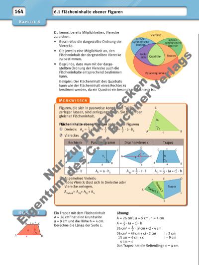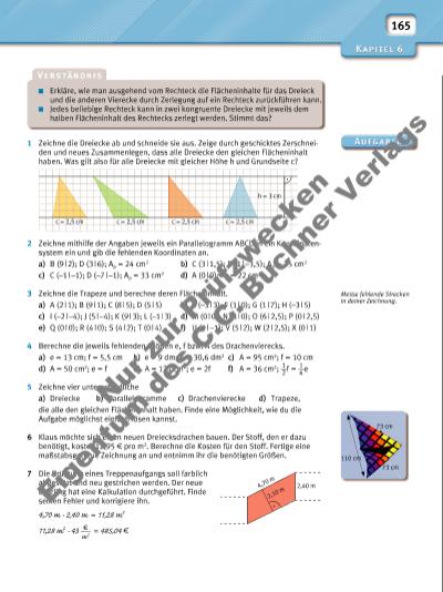 165 1 Zeichne die Dreiecke ab und schneide sie aus. Zeige durch geschicktes Zerschneiden und neues Zusammenlegen, dass alle Dreiecke den gleichen Flächeninhalt haben. Was gilt also für alle Dreiecke mit gleicher Höhe h und Grundseite c? 2 Zeichne mithilfe der Angaben jeweils ein Parallelogramm ABCD in ein Koordinatensystem ein und gib die fehlenden Koordinaten an. a) B (9 | 2); D (3 | 6); AP = 24 cm 2 b) C (3 | 1,5); B (1 | –3,5); AP = 35 cm 2 c) C (–1 | –1); D (–7 | –1); AP = 33 cm 2 d) A (0 | 0); AP = 22 cm 2 3 Zeichne die Trapeze und berechne deren Flächeninhalt. a) A (2 | 1); B (9 | 1); C (8 | 5); D (5 | 5) b) E (–3 | 3); F (1 | 0); G (1 | 7); H (–3 | 5) c) I (–2 | –4); J (5 | –4); K (9 | 3); L (–1 | 3) d) M (0 | 0); N (3 | 0); O (6 | 2,5); P (0 | 2,5) e) Q (0 | 0); R (4 | 0); S (4 | 2); T (0 | 4) f) U (1 | –1); V (5 | 2); W (2 | 2,5); X (0 | 1) 4 Berechne die jeweils fehlenden Größen e, f bzw. A des Drachenvierecks. a) e = 13 cm; f = 5,5 cm b) e = 9 dm; A = 30,6 dm2 c) A = 95 cm2; f = 10 cm d) A = 50 cm2; e = f e) A = 121 cm2; e = 2f f) A = 36 cm2; 1 __ 2 f = 1 __ 4 e 5 Zeichne vier unterschiedliche a) Dreiecke b) Parallelogramme c) Drachenvierecke d) Trapeze, die alle den gleichen Flächeninhalt haben. Finde eine Möglichkeit, wie du die Aufgabe möglichst einfach lösen kannst. 6 Klaus möchte sich einen neuen Dreiecksdrachen bauen. Der Stoff, den er dazu benötigt, kostet 12,95 f pro m2. Berechne die Kosten für den Stoff. Fertige eine maßstabsgetreue Zeichnung an und entnimm ihr die benötigten Größen. 7 Die Brüstung eines Treppenaufgangs soll farblich abgesetzt und neu gestrichen werden. Der neue Lehrling hat eine Kalkulation durchgeführt. Finde seinen Fehler und korrigiere ihn. Erkläre, wie man ausgehend vom Rechteck die Flächeninhalte für das Dreieck und die anderen Vierecke durch Zerlegung auf ein Rechteck zurückführen kann. Jedes beliebige Rechteck kann in zwei kongruente Dreiecke mit jeweils dem halben Flächeninhalt des Rechtecks zerlegt werden. Stimmt das? c = 2,5 cm c = 2,5 cm c = 2,5 cm c = 2,5 cm h = 3 cm 73 cm 73 cm 110 cm 2,40 m4,7 0 m 2,1 0 m 4,70 m · 2,40 m = 11,28 m2 11,28 m2 · 43 f __ m2 = 485,04 f Messe fehlende Strecken in deiner Zeichnung. Nu r z ur P rü fzw ck en Ei ge nt um d es C .C . B uc hn er V er la gs | |