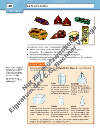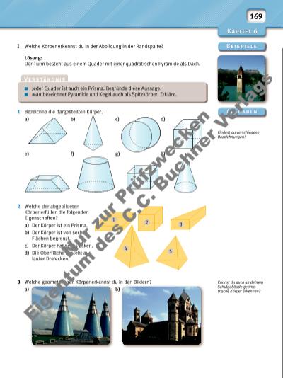 169 I Welche Körper erkennst du in der Abbildung in der Randspalte? Lösung: Der Turm besteht aus einem Quader mit einer quadratischen Pyramide als Dach. 1 Bezeichne die dargestellten Körper. a) b) c) d) e) f) g) h) 2 Welche der abgebildeten Körper erfüllen die folgenden Eigenschaften? a) Der Körper ist ein Prisma. b) Der Körper ist von sechs Flächen begrenzt. c) Der Körper hat sechs Ecken. d) Die Oberfl äche besteht aus lauter Dreiecken. 3 Welche geometrischen Körper erkennst du in den Bildern? a) b) Findest du verschiedene Bezeichnungen? Kannst du auch an deinem Schulgebäude geometrische Körper erkennen? Jeder Quader ist auch ein Prisma. Begründe diese Aussage. Man bezeichnet Pyramide und Kegel auch als Spitzkörper. Erkläre. 1 4 5 32 Nu r z ur P rü fzw ec ke n Ei ge nt um d es C .C . B uc hn er V er la gs | |