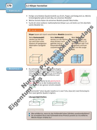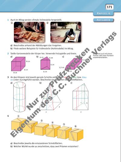 171 1 Auch im Alltag werden oftmals Vollmodelle hergestellt. 1 2 a) Beschreibe anhand der Abbildungen das Vorgehen. b) Finde weitere Beispiele für Vollmodelle (Hohlmodelle) im Alltag. 2 Stelle Kantenmodelle der Körper her. Verwende Holzspieße und Knete. a) b) c) 3 An den Körpern sind jeweils gerade Schnitte entlang den roten, grünen bzw. blauen Linien durchgeführt worden. Beschreibe das Aussehen der Schnittfl ächen. a) b) c) 4 a) Beschreibe jeweils die entstandenen Schnittfl ächen. b) Welcher Würfel wurde so zerschnitten, dass zwei Prismen entstehen? 1 2 3 4 5 6 a a a bc 8 cm 8 cm 8 cm 6 cm 6 cm6 cm 6 cm 5 cm 2,2 cm 8 cm 4 cm 2 cm Du kannst auch mit einem Partner oder einer Partnerin zusammenarbeiten. Nu r z ur P rü fzw ec ke n Ei ge nt um d es C .C . B uc hn er V er la gs | |