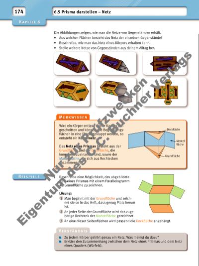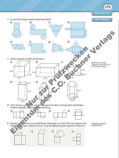 175 1 Zu welchem Körper gehört jeweils das Netz? a) b) c) d) e) f) g) h) 2 Zeichne jeweils ein Netz des Körpers. a) b) c) d) e) f) 3 Finde heraus, welche der vier Abbildungen kein Netz eines geraden dreiseitigen Prismas darstellt. Begründe deine Meinung. 1 2 3 4 4 Das Netz des Prismas ist unvollständig. Übertrage es in dein Heft und ergänze zum vollständigen Netz. Färbe die Grundund Deckfl äche jeweils in gleicher Farbe ein. Findest du mehrere Möglichkeiten? Denke bei c) an den Thaleskreis und bei d) an die Kongruenzsätze. 1 2 3 4 4 cm 4 cm 4 cm 8 cm 4 cm 3,6 cm 4 cm 1,5 cm 1,5 cm 2,5 cm 4 cm 4 cm 3 cm 7 cm 4 cm4 cm 6 cm 4 cm 2,6 cm 1,5 cm Nu r z ur P rü fzw ec ke n Ei ge nt um es C .C . B uc hn er V er la gs | |