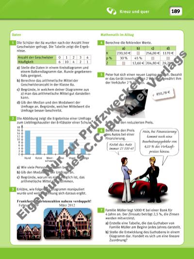 Kreuz und quer 189 Daten 1 Die Schüler der 8a wurden nach der Anzahl ihrer Geschwister gefragt. Die Tabelle zeigt die Ergebnisse. a) Stelle die Daten in einem Kreisdiagramm und einem Balkendiagramm dar. Runde gegebenenfalls geeignet. b) Berechne das arithmetische Mittel der Geschwisteranzahl in der Klasse 8a. c) Begründe, in welchem deiner Diagramme aus a) man das arithmetische Mittel gut darstellen kann. d) Gib den Median und den Modalwert der Umfrage an. Begründe, welcher Mittelwert die Umfrage besser beschreibt. 2 Die Abbildung zeigt die Ergebnisse einer Umfrage zum Lieblingshaustier der 8-Klässler einer Schule. a) Wie viele Personen wurden befragt? b) Gib den Modalwert der Umfrage an. c) Begründe, warum es nicht möglich ist, das arithmetische Mittel zu bestimmen. 3 Erkläre, wie folgendes Diagramm manipuliert wurde und welche Wirkung sich daraus ergibt. Frankfurts Touristenzahlen nahezu verdoppelt! Februar 2009 März 2012 Anzahl der Geschwister 0 1 2 3 4 Häufi gkeit 6 10 4 2 1 Hund 0 2 4 6 8 10 12 14 16 18 Katze Meerschwein Hase Vogel Sonstige Mathematik im Alltag 4 Berechne die fehlenden Werte. 5 Peter hat sich einen neuen Laptop gekauft. Bezahlt er das Gerät innerhalb von 2 Wochen, gewährt ihm der Verkäufer 2 % Skonto. Berechne den reduzierten Preis. 6 Berechne den Preis des Autos bei einer Finanzierung. 7 Familie Müller legt 5000 f bei einer Bank für 4 Jahre an. Der Zinssatz beträgt 2,5 %, die Zinsen werden mitverzinst. a) Erstelle eine Tabelle, die das Guthaben von Familie Müller am Beginn jedes Jahres darstellt. b) Stelle die Entwicklung des Guthabens in einem Diagramm dar. Handelt es sich um eine lineare Zuordnung? a) b) c) d) K 230,50 f 256,00 f 1170 f p % 30 % 45 % Z 12,60 f 204,80 f 29,25 f 850,78 f Kostet das Auto immer 21 500 f? Nein, bei Finanzierung kommt noch eine Bearbeitungsgebühr von 4,20 % des Verkaufspreises hinzu. N r z ur P rü fzw ec ke Ei ge nt um d es C .C . B uc hn er V er la gs | |