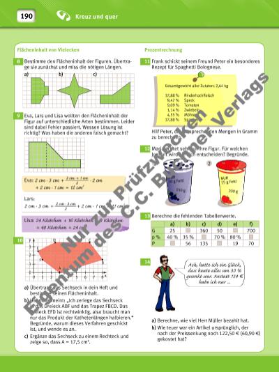 Grundwissen 1 ___ 12 + 4 __ 9 = 3 ___ 36 + 16 ___ 36 = 3 + 16 _____ 36 = 19 ___ 36 Hauptnenner: 36, denn V12 = {12; 24; 36; 48; …} V9 = {9; 18; 27; 36; 45; …} Ungleichnamige Brüche werden vor dem Addieren (Subtrahieren) erst auf denselben (Haupt-)Nenner erweitert bzw. gekürzt. Anschließend wird der Zähler addiert (subtrahiert), der gemeinsame Nenner bleibt erhalten. Unter dem Hauptnenner versteht man das kleinste gemeinsame Vielfache der Nenner. 4 __ 7 · 2 __ 9 = 4 · 2 ____7 · 9 = 8 ___ 63 Zwei Brüche werden multipliziert, indem man Zähler mit Zähler und Nenner mit Nenner multi pliziert. 3 __ 4 : 2 __ 3 = 3 __ 4 · 3 __ 2 = 3 · 3 ____4 · 2 = 9 __ 8 Man dividiert eine Zahl durch einen Bruch, indem man mit seinem Kehrbruch multipliziert. Beim Kehrbruch werden Zähler und Nenner des Bruchs vertauscht. Aufrunden (hier auf Zehner) Abrunden (hier auf Hunderter) 238 240 238 ≈ 200 Große Zahlen werden oftmals gerundet. Beim Runden auf einen Stellenwert betrachtet man den benachbarten kleineren Stellenwert genauer. Bei den Ziffern 0, 1, 2, 3, 4 wird ab gerundet, bei den Ziffern 5, 6, 7, 8, 9 wird auf gerundet. Primzahlen bis 100: 2, 3, 5, 7, 11, 13, 17, 19, 23, 29, 31, 37, 41, 43, 47, 53, 59, 61, 67, 71, 79, 83, 89, 97 Eine Zahl, die genau zwei (verschiedene) Teiler hat, nämlich sich selbst und die 1, heißt Primzahl. 1 km = 1000 m 1 m = 10 dm 1 dm = 10 cm 1 cm = 10 mm Die Länge einer Strecke wird in der Regel durch die Maßeinheiten Kilometer (km), Meter (m), Dezimeter (dm), Zentimeter (cm) oder Millimeter (mm) angegeben. 1 t = 1000 kg 1 kg = 1000 g 1 g = 1000 mg Für die Masse eines Gegenstands sind die Maßeinheiten Tonne (t), Kilogramm (kg), Gramm (g) oder Milligramm (mg) üblich. Multiplikation Kehrbruch 191 Nu r z ur P rü fzw ec ke n Ei ge nt um d es C .C . B uc h er V er la gs | |