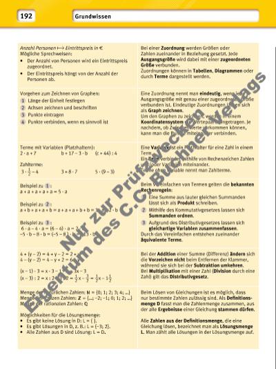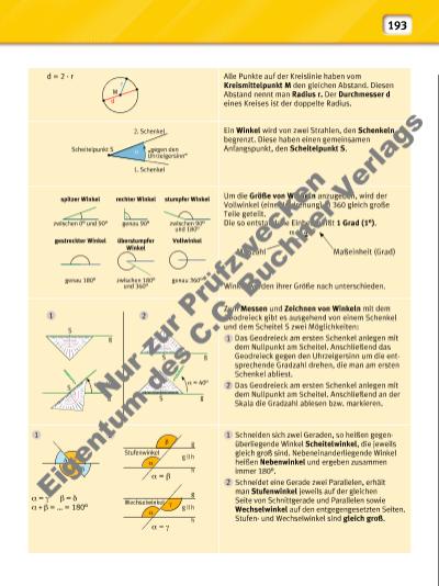 d = 2 · r Alle Punkte auf der Kreislinie haben vom Kreis mittelpunkt M den gleichen Abstand. Diesen Abstand nennt man Radius r. Der Durchmesser d eines Kreises ist der doppelte Radius. Ein Winkel wird von zwei Strahlen, den Schenkeln, begrenzt. Diese haben einen gemeinsamen Anfangspunkt, den Scheitelpunkt S. Um die Größe von Winkeln anzugeben, wird der Vollwinkel (eine Umdrehung) in 360 gleich große Teile geteilt. Die so entstandene Einheit heißt 1 Grad (1°). α = 40° Winkel werden ihrer Größe nach unterschieden. Zum Messen und Zeichnen von Winkeln mit dem Geodreieck gibt es ausgehend von einem Schenkel und dem Scheitel S zwei Möglichkeiten: 1 Das Geodreieck am ersten Schenkel anlegen mit dem Nullpunkt am Scheitel. Anschließend das Geodreieck gegen den Uhrzeigersinn um die entsprechende Gradzahl drehen, die man am ersten Schenkel abliest. 2 Das Geodreieck am ersten Schenkel anlegen mit dem Nullpunkt am Scheitel. Anschließend an der Skala die Gradzahl ablesen bzw. markieren. 1 2 = = + = … = 180° 1 Schneiden sich zwei Geraden, so heißen gegenüberliegende Winkel Scheitelwinkel, die jeweils gleich groß sind. Nebeneinanderliegende Winkel heißen Nebenwinkel und ergeben zusammen immer 180°. 2 Schneidet eine Gerade zwei Parallelen, erhält man Stufenwinkel jeweils auf der gleichen Seite von Schnittgerade und Parallelen sowie Wechselwinkel auf den entgegengesetzten Seiten. Stufenund Wechselwinkel sind gleich groß. r M d 2. Schenkel Scheitelpunkt S 1. Schenkel „gegen den Uhrzeigersinn“ rechter Winkel überstumpfer Winkel stumpfer Winkel Vollwinkel spitzer Winkel gestreckter Winkel Maßzahl Maßeinheit (Grad) 7 6 5 4 3 2 1 0 1 2 3 4 5 6 7 765432101234567 765432101234567 7 6 5 4 3 2 1 0 1 2 3 4 5 6 7 1 2 gSg S g S gS γ αs β δ Stufenwinkel g g || h g || h g h h β α α = β α = γ Wechselwinkel γ α 193 Nu r z ur P rü fzw ec k n Ei ge nt um d es C .C . B uc hn er V er la gs | |
