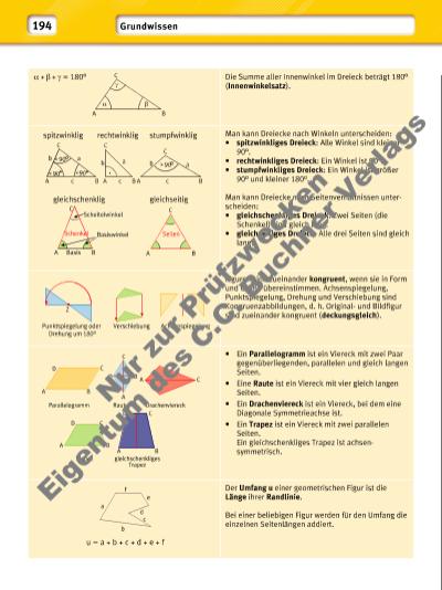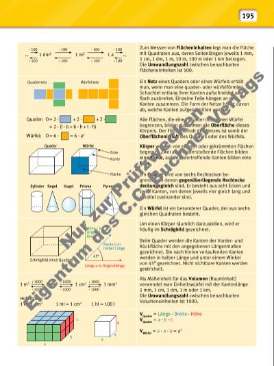 Zum Messen von Flächeninhalten legt man die Fläche mit Quadraten aus, deren Seitenlängen jeweils 1 mm, 1 cm, 1 dm, 1 m, 10 m, 100 m oder 1 km betragen. Die Umwandlungszahl zwischen benachbarten Flächeneinheiten ist 100. Ein Netz eines Quaders oder eines Würfels erhält man, wenn man eine quaderoder würfelförmige Schachtel entlang ihrer Kanten aufschneidet und fl ach ausbreitet. Einzelne Teile hängen an den Kanten zusammen. Die Form der Netze hängt davon ab, welche Kanten aufgeschnitten werden. Alle Flächen, die einen Quader oder einen Würfel begrenzen, bilden zusammen die Oberfl äche dieses Körpers. Der Flächeninhalt des Netzes ist somit der Oberfl ächeninhalt des Quaders oder des Würfels. Körper werden von ebenen oder gekrümmten Flächen begrenzt. Zwei aneinanderstoßende Flächen bilden eine Kante, aufeinandertreffende Kanten bilden eine Ecke. Ein Quader wird von sechs Rechtecken begrenzt, von denen gegenüberliegende Rechtecke deckungsgleich sind. Er besteht aus acht Ecken und zwölf Kanten, von denen jeweils vier gleich lang und parallel zueinander sind. Ein Würfel ist ein besonderer Quader, der aus sechs gleichen Quadraten besteht. Um einen Körper räumlich darzustellen, wird er häufi g im Schrägbild gezeichnet. Beim Quader werden die Kanten der Vorderund Rückfl äche mit den angegebenen Längenmaßen gezeichnet. Die nach hinten verlaufenden Kanten werden in halber Länge und unter einem Winkel von 45° gezeichnet. Nicht sichtbare Kanten werden gestrichelt. 1 m3 1 dm3 1 cm3 1 mm3 Hohlmaße: 1 l = 1 dm3 1 ml = 1 cm3 1 hl = 100 l Als Maßeinheit für das Volumen (Rauminhalt) verwendet man Einheitswürfel mit der Kantenlänge 1 mm, 1 cm, 1 dm, 1 m oder 1 km. Die Umwandlungszahl zwischen benachbarten Volumeneinheiten ist 1000. VQuader = Länge · Breite · Höhe VQuader = a · b · c VWürfel = a · a · a = a 3 Quader Fläche Ecke Kante Würfel Zylinder Kegel Kugel Prisma Pyramide Höhe c in Originallänge Länge a in Originallänge Breite b in halber Länge Schrägbild eines Quaders : 1000 · 1000 : 1000 · 1000 : 1000 · 1000 c b a a a a O O 195 Nu r z ur P rü fzw ec ke n Ei ge nt um d es C .C . B uc hn er V er la gs | |