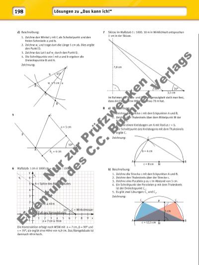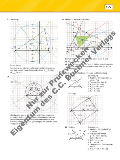 199 6 R C K r s t B S A P y 1 0 0 x 5 4 3 2 1 –1 –2 –1–2 2 3 4 5 6 7 8 9 11 a) b) c) Die fertige Konstruktion: Die Koordinaten des Umkreismittelpunktes lauten M (2 | 2). d) R (1 | 5) und S (–2 | –1) e) Da der Kreis K Inkreis des Dreiecks PRS ist, sind die Geraden durch M und die Eckpunkte Winkelhalbierende der Winkel an den Eckpunkten. 12 Konstruktion mit Planfigur, Zeichnung und Beschreibung a) Planfigur: Beschreibung: 1. Festlegen der Diagonalen ___ AC mit e = 7 cm 2. Thaleskreis kT über ___ AC 3. k1 (A; r = a = 4 cm) 4. k2 (C; r = a = 4 cm) 5. k1T kT = {B} 6. k2T kT = {D} Zeichnung: b) Planfigur: Beschreibung: 1. Festlegen der Strecke ___ AB mit a = 6 cm 2. Antragen des Winkels β = δ = 70° in B an ___ AB, freier Schenkel s 3. k (B; r = b = 5 cm) 4. k T s = {C} 5. Zeichnen von Z als Mittelpunkt von ___ AC 6. k (Z; r = ___ BZ) T BZ = {D} 9 Zeichnung: Beschreibung: Konstruiere den Inkreis mithilfe der Winkelhalbierenden und den Umkreis mithilfe der Mittelsenkrechten; MInkreis(1,5 | 1); MUmkreis (–0,5 | 1). 10 Mittelsenkrechte und Winkelhalbierende fallen zusammen. Damit fällt auch der Schnittpunkt der Mittelsenkrechten mit dem Schnittpunkt der Winkelhalbierenden zusammen. Der Umkreis und der Inkreis des gleichseitigen Dreiecks ABC haben denselben Mittelpunkt. D c = a e f = e aA C B A B D C M e = 7 cm c = a = 4 cm a = 4 cm D δ β = δ d = b a b c = a A C B Z 6 5 4 3 2 1 1 2 3 4 5 6 –1 –1–2–3–4–5–6 A B C M InkreisM Umkreis –2 –3 –4 mb = wβ ma = wα C B Mu = Mi a = b = c = 4 cm A c a b α β Nu r z ur P rü fzw ec ke n Ei ge t m d es C .C . B ch ne r V er la gs | |