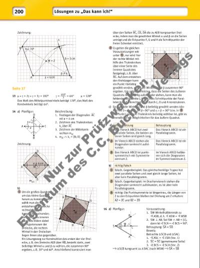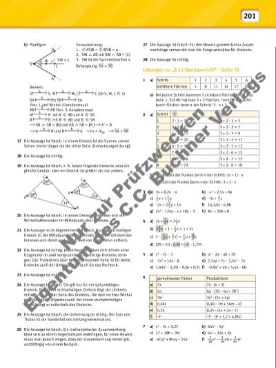 201 b) Planfigur: Voraussetzung: 1. ASW = WSB = α 2. SW AB mit SW T AB = {C} 3. SW ist die Symmetrieachse s. Behauptung: ___ SA = ___ SB Beweis: S s S, W s W, C s C (da S, W, C X s) SA s SB; SB s SA (Vor. 1 und Winkel-/Geradentreue) AB s AB (Vor. 2, Geradentreue) A s A' mit A' X AB und A' X SB B s B' mit B' X AB und B' X SA AB T SB = {B} und AB T SB = {A'} A' = B A s B und B s A s = m __ AB ___ SA = ___ SB 17 Die Aussage ist falsch. In einem Dreieck ist die Summe zweier Seiten immer länger als die dritte Seite (Dreiecksungleichung). 18 Die Aussage ist richtig. 19 Die Aussage ist falsch, z. B. haben folgende Dreiecke zwar die gleiche Gestalt, aber ein Dreieck ist größer als das andere. 20 Die Aussage ist falsch. In jedem Dreieck schneiden sich die Winkelhalbierenden im Mittelpunkt des Inkreises. 21 Die Aussage ist im Allgemeinen Fall falsch. Nur im gleichseitigen Dreieck ist der Mittelpunkt des Umkreises identisch mit dem des Inkreises und damit auch gleich weit von allen Seiten entfernt. 22 Die Aussage ist richtig. Jedes Rechteck lässt sich mittels einer Diagonalen in zwei kongruente rechtwinklige Dreiecke zerlegen. Der Thaleskreis über der gemeinsamen Seite ist für beide Dreiecke auch der Umkreis, also auch für das Rechteck. 23 Die Aussage ist richtig. 24 Die Aussage ist falsch. Sie gilt nur für ein spitzwinkliges Dreieck. Bei einem rechtwinkligen Dreieck liegt der Umkreismittelpunkt auf der Seite des Dreiecks, die dem rechten Winkel gegenüberliegt (Hypotenuse); bei einem stumpfwinkligen Dreieck liegt er außerhalb des Dreiecks. 25 Die Aussage ist falsch, die Umkehrung ist richtig: Der Satz des Thales ist ein Sonderfall des Umfangs winkelsatzes. 26 Die Aussage ist falsch. Ein mathematischer Zusammenhang lässt sich an einem Gegenbeispiel wider legen, für einen Beweis muss man jedoch zeigen, dass der Zusammenhang immer gilt, unabhängig von einem Beispiel. 27 Die Aussage ist falsch: Für den Beweis geometrischer Zusammenhänge verwendet man die Kongruenzsätze für Dreiecke. 28 Die Aussage ist richtig. Lösungen zu „2.11 Das kann ich!“ – Seite 70 1 a) b) Bei jedem Schritt kommen 3 sichtbare Flächen hinzu. Nur beim 1. Schritt hat man 3 + 2 Flächen. Term für die sichtbaren Flächen beim n-ten Schritt: 3 · n + 2 2 a) b) 1 Anzahl der Punkte beim n-ten Schritt: (n + 1) · n 2 Zahl der Punkte beim n-ten Schritt: 3 + 2 · n 3 a) 3x + 8,2y – 4 b) –x2 + 2,5x + 9y c) 2 __ 5 x + 1 1 __ 5 y d) –3x + 4 __ 5 y e) –2x + 2 2 __ 3 y + 14 f) 16,1ab – 6,9b g) 2x2 – 12xy – x + 18y – 3 h) 8x2 + 20x + 8 4 a) 2x + 1 __ 2 x = 2 1 __ 2 x b) 3 1 __ 3 s + 1 – 1 __ 3 s = 1 + 3s c) 2 · ( 1 __ 9 u + 2 __ 7 v ) = 2 __ 9 u + 4 __ 7 v d) (28 + 5t) : (–4) = –7 – 1,25t 5 a) x2 – 2x – 3 b) a2 – 2a – ab + 2b c) –3x2 + 14x – 8 d) 2,5xy + 7x – 2,5y2 – 7y e) 1,44s2 – 1,2st – 0,6s + 0,5t f) –0,9a2 + ab + 5,4a – 6b 6 7 a) x2 – 3x + 2,25 b) 64x2 – 4y2 c) 27 + 18h + 3h2 d) 4x2 + 24x + 36 e) –81y2 + 90xy – 25x2 f) 3 ___ 16 a 2 – 3 ___ 16 ab + 3 ___ 64 b 2 S C B A Wα α SW = s C 33° 88° 58° B A 58° 88° 33° A C B Schritt 1 2 1 2 · 1 = 2 3 + 2 · 1 = 5 2 3 · 2 = 6 3 + 2 · 2 = 7 3 4 · 3 = 12 3 + 2 · 3 = 9 4 5 · 4 = 20 3 + 2 · 4 = 11 5 6 · 5 = 30 3 + 2 · 5 = 13 6 7 · 6 = 42 3 + 2 · 6 = 15 7 8 · 7 = 56 3 + 2 · 7 = 17 8 9 · 8 = 72 3 + 2 · 8 = 19 gemeinsamer Faktor Produktterm a) 7x 7x · (x + 3) b) 6a 6a · (2b – 6a + 3b2) c) 3x2 3x2 · (5x + 4y) d) 0,4kl 0,4kl · (m + 5km – 4) e) 0,2x 0,2x · (4x + 2a – 1) f) –t2 –t2 · (t2 + 1,2 + 4,8ts) Schritt 1 2 3 4 5 6 sichtbare Flächen 5 8 11 14 17 20 Nu r z ur P rü fzw ec ke n E g nt u d es C .C . B uc hn er V er la gs | |