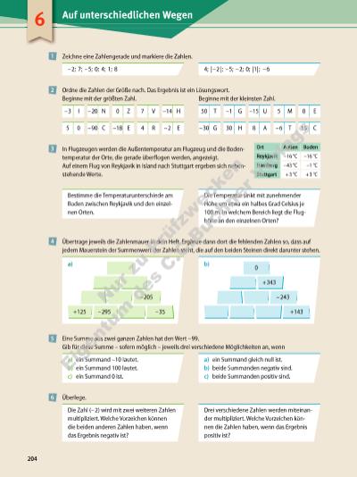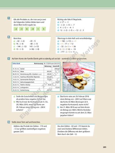 Auf dem Konto der Familie Eberle geht es ständig auf und ab – zumindest bildlich gesprochen. Delta-Bank Kontoauszug Nr. 17/2016 vom 26.03.16 Belastung Gutschrift 01. 03. 16 Gehalt 2000,00 04. 03. 16 Miete 850,00 06. 03. 16 Versicherung (Kfz-, Krankenu. a.) 430,00 12. 03. 16 Autohaus Mutschler, Reparatur 675,00 14. 03. 16 Gartencenter Blattgrün 111,00 18. 03. 16 Geburtstagsgeschenk 250,00 20. 03. 16 Telefon (Handy) 39,00 24. 03. 16 Lottogewinn 125,00 25. 03. 16 Arztrechnung 381,00 Stelle einen Term auf und berechne. Gib alle Produkte an, die man aus je zwei der folgenden Zahlen bilden kann und deren Wert nicht negativ ist. Richtig oder falsch? Begründe. a) (–1)³ < –1 b) –(–2) · (–3) > –7 c) 4 : (–1) = –4 : 1 d) 12 : (–2) : (–3) < –12 : 2 : 3 –2 –3 0 –4 1 5 Berechne. a) –42 : (–6) –81 : 9 b) 76 : (–4) –85 : (–5) c) –144 : (–12) 143 : (+13) d) 15 : (–3) (+56) : (–8) Übertrage in dein Heft und vervollständige. a) ■182 : (–13) = –■ b) –■ : 17 = ■12 c) –32 : (+■) = ■26 d) (–■) : (■6) = –14 e) –777 : (–■) = 11 a) Stelle die Gutschriften und Belastungen als positive bzw. negative Zahlen dar. b) Wie hoch war der Kontostand am 4. (12., 20.) März 2016, wenn das Konto am 29. Februar einen Betrag von –240 € aufwies? a) Das Konto wies am 29. Februar 2016 einen Betrag von –240 € auf. Wann war das Konto im März überzogen (d. h. negativer Kontostand), wann nicht? b) Am 31. März 2016 war auf dem Konto ein Betrag von 400 €. Welche Kontobewegungen könnte es seit dem 25. März gegeben haben? Addiere das Produkt der Zahlen –174 und –12 zur größten zweistelligen negativen ganzen Zahl. Aus den Zahlen –63 und –315 kannst du zwei verschiedene Differenzen bilden. Dividiere die Differenz mit dem größeren Wert durch die Zahl –12. 205 Nu r z u Pr üf zw ec ke n Ei ge nt um d es C .C .B uc hn er V er la gs | |