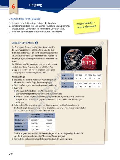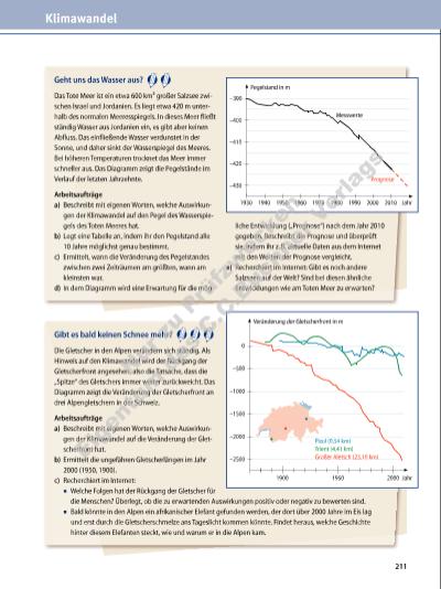 Gibt es bald keinen Schnee mehr? Die Gletscher in den Alpen verändern sich ständig. Als Hinweis auf den Klimawandel wird der Rückgang der Gletscherfront angesehen, also die Tat sache, dass die „Spitze“ des Gletschers immer weiter zurückweicht. Das Diagramm zeigt die Veränderung der Gletscherfront an drei Alpengletschern in der Schweiz. Arbeitsaufträge a) Beschreibt mit eigenen Worten, welche Auswirkungen der Klimawandel auf die Veränderung der Gletscherfront hat. b) Ermittelt die ungefähren Gletscherlängen im Jahr 2000 (1950, 1900). c) Recherchiert im Internet: ▪ Welche Folgen hat der Rückgang der Gletscher für die Menschen? Überlegt, ob die zu erwartenden Auswirkungen positiv oder negativ zu bewerten sind. ▪ Bald könnte in den Alpen ein afrikanischer Elefant gefunden werden, der dort über 2000 Jahre im Eis lag und erst durch die Gletscherschmelze ans Tageslicht kommen könnte. Findet heraus, welche Geschichte hinter diesem Elefanten steckt, wie und warum er in die Alpen kam. Geht uns das Wasser aus? Das Tote Meer ist ein etwa 600 km² großer Salzsee zwischen Israel und Jordanien. Es liegt etwa 420 m unterhalb des normalen Meeres spiegels. In dieses Meer fließt ständig Wasser aus Jordanien ein, es gibt aber keinen Abfluss. Das einfließende Wasser verdunstet in der Sonne, und daher sinkt der Wasserspiegel des Meeres. Bei höheren Temperaturen trocknet das Meer immer schneller aus. Das Diagramm zeigt die Pegelstände im Verlauf der letzten Jahrzehnte. Arbeitsaufträge a) Beschreibt mit eigenen Worten, welche Auswirkungen der Klimawandel auf den Pegel des Wasserspiegels des Toten Meeres hat. b) Legt eine Tabelle an, indem ihr den Pegelstand alle 10 Jahre möglichst genau bestimmt. c) Ermittelt, wann die Veränderung des Pegelstandes zwischen zwei Zeiträumen am größten, wann am kleinsten war. d) In dem Diagramm wird eine Erwartung für die mögliche Entwicklung („Prognose“) nach dem Jahr 2010 gegeben. Beschreibt die Prognose und überprüft sie, indem ihr z. B. aktuelle Daten aus dem Internet mit den Werten der Prognose vergleicht. e) Recherchiert im Internet: Gibt es noch andere Salzseen auf der Welt? Sind bei diesen ähnliche Entwicklungen wie am Toten Meer zu erwarten? 211 Klimawandel –2500 Veränderung der Gletscherfront in m –2000 –1500 –1000 –500 0 Jahr20001900 1950 Pizol (0,54 km) Trient (4,41 km) Großer Aletsch (23,10 km) –430 1930 –420 –410 –400 –390 1940 1950 1960 1970 1980 1990 2000 2010 Jahr Pegelstand in m Messwerte Prognose Nu r z u Pr üf zw ck en Ei ge nt um d es C .C .B uc hn er V er la gs | |