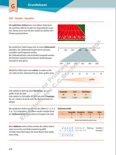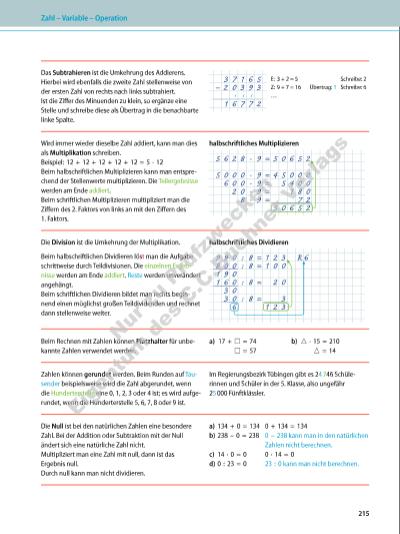 Das Subtrahieren ist die Umkehrung des Addierens. Hierbei wird ebenfalls die zweite Zahl stellenweise von der ersten Zahl von rechts nach links subtrahiert. Ist die Ziffer des Minuenden zu klein, so ergänze eine Stelle und schreibe diese als Übertrag in die benachbarte linke Spalte. 3 7 1 6 5 E: 3 + 2 = 5 Schreibe: 2 – 2 0 3 9 3 Z: 9 + 7 = 16 Übertrag: 1 Schreibe: 6 1 1 1 … 1 6 7 7 2 Wird immer wieder dieselbe Zahl addiert, kann man dies als Multiplikation schreiben. Beispiel: 12 + 12 + 12 + 12 + 12 = 5 · 12 Beim halbschriftlichen Multiplizieren kann man entsprechend der Stellenwerte multiplizieren. Die Teilergebnisse werden am Ende addiert. Beim schriftlichen Multiplizieren multipliziert man die Ziffern des 2. Faktors von links an mit den Ziffern des 1. Faktors. halbschriftliches Multiplizieren 5 6 2 8 · 9 = 5 0 6 5 2 5 0 0 0 · 9 = 4 5 0 0 0 6 0 0 · 9 = 5 4 0 0 2 0 · 9 = 1 8 0 8 · 9 = 7 2 5 0 6 5 2 Die Division ist die Umkehrung der Multiplikation. Beim halbschriftlichen Dividieren löst man die Aufgabe schrittweise durch Teildivisionen. Die einzelnen Ergebnisse werden am Ende addiert. Reste werden unverändert angehängt. Beim schriftlichen Dividieren bildet man rechts beginnend einen möglichst großen Teildividenden und rechnet dann stellenweise weiter. halbschriftliches Dividieren 9 9 0 : 8 = 1 2 3 R 6 8 0 0 : 8 = 1 0 0 1 9 0 1 6 0 : 8 = 2 0 3 0 3 0 : 8 = 3 6 1 2 3 Beim Rechnen mit Zahlen können Platzhalter für unbekannte Zahlen verwendet werden. a) 17 + □ = 74 □ = 57 b) △ · 15 = 210 △ = 14 Zahlen können gerundet werden. Beim Runden auf Tausender beispielsweise wird die Zahl abgerundet, wenn die Hunderterstelle eine 0, 1, 2, 3 oder 4 ist; es wird aufgerundet, wenn die Hunderterstelle 5, 6, 7, 8 oder 9 ist. Im Regierungsbezirk Tübingen gibt es 24 746 Schülerinnen und Schüler in der 5. Klasse, also ungefähr 25 000 Fünftklässler. Die Null ist bei den natürlichen Zahlen eine besondere Zahl. Bei der Addition oder Subtraktion mit der Null ändert sich eine natürliche Zahl nicht. Multipliziert man eine Zahl mit null, dann ist das Ergebnis null. Durch null kann man nicht dividieren. a) 134 + 0 = 134 0 + 134 = 134 b) 238 – 0 = 238 0 – 238 kann man in den natürlichen Zahlen nicht berechnen. c) 14 · 0 = 0 0 · 14 = 0 d) 0 : 23 = 0 23 : 0 kann man nicht berechnen. Zahl – Variable – Operation 215 Nu r z u Pr üf zw ec ke n Ei ge nt um d es C .C .B uc ne r V er la gs | |