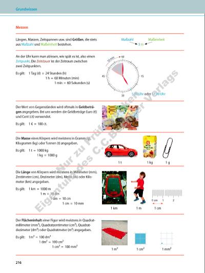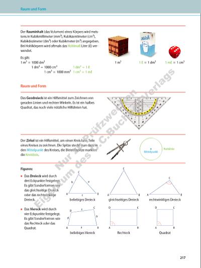 Der Rauminhalt (das Volumen) eines Körpers wird meistens in Kubikmillimeter (mm³), Kubikzentimeter (cm³), Kubik dezimeter (dm³) oder Kubikmeter (m³) angegeben. Bei Hohlkörpern wird oftmals das Hohlmaß Liter (ℓ) verwendet. Es gilt: 1 m³ = 1000 dm³ 1 dm³ = 1000 cm³ 1 dm³ = 1 ℓ 1 cm³ = 1000 mm² 1 cm³ = 1 mℓ 1 m³ 1 ℓ = 1 dm³ 1 mℓ = 1 cm³ Raum und Form Das Geodreieck ist ein Hilfsmittel zum Zeichnen von geraden Linien und rechten Winkeln. Es ist ein halbes Quadrat, das noch viele nützliche Hilfslinien hat. Der Zirkel ist ein Hilfsmittel, um einen Kreis bzw. Teile eines Kreises zu zeichnen. Die Spitze steckt man dazu in den Mittelpunkt des Kreises, die Bleistiftspitze markiert die Kreislinie. Mittelpunkt Kreislinie Figuren: ▪ Das Dreieck wird durch drei Eckpunkte festgelegt. Es gibt Sonderformen wie das gleichseitige Dreieck oder das rechtwinklige Dreieck. C A c ab B beliebiges Dreieck C A B gleichseitiges Dreieck C A B rechtwinkliges Dreieck ▪ Das Viereck wird durch vier Eckpunkte festgelegt. Es gibt Sonderformen wie das Rechteck oder das Quadrat. C D A a b c d B beliebiges Viereck CD A B Rechteck CD A B Quadrat Raum und Form 217 Nu r z u Pr üf zw ec ke n Ei ge nt um d es C .C .B uc hn er V er la gs | |