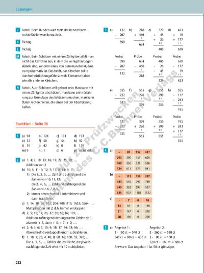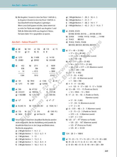b) Bei Angebot 1 kostet in dem 3er-Pack 1 Heft 60 ct. In Angebot 2 kostet in dem 4er-Pack 1 Heft 65 ct. Das Einzelheft ist bei Angebot 2 günstiger. Wenn Lena Geld sparen möchte, dann nimmt sie so viele 3er-Packs wie möglich aus Angebot 1 und füllt die fehlenden Hefte aus Angebot 2 hinzu. Sie kann dabei 10 ct gegenüber a) sparen. Am Ziel ! – Seiten 70 und 71 a) 88 b) 144 c) 126 d) 134 e) 73 f) 32 g) 51 h) 35 i) 0 a) 1270 b) 11 608 c) 14 150 f) 20 883 g) 28 902 h) 263 608 a) 452 838 + 14 1304 b) 2311 384 + 4315 7010 c) 9039 9983 + 3899 22 921 a) 101 b) 7810 c) 1346 d) 87 e) 1273 f) 3087 g) 52 879 a) 506 b) 47 552 c) 391 034 d) 223 672 e) 709 956 f) 115 128 g) 1 183 888 h) 1 271 790 i) 409 356 a) 12⁴ b) 3⁸ c) 4³ ∙ 2³ a) 8; 243; 16 b) 1728; 289; 361 c) 1024; 14; 1 a) 735 b) 216 c) 216 d) 1345 R 5 e) 3654 f) 8547 g) 64 Rest 35 268 Verschiedene Ansichten desselben Rechtecks werden nicht mitgezählt. Bei der Aufzählung wird jeweils die Anzahl der Kästchen in der Länge und Breite eines Rechtecks angegeben. a) 2 Möglichkeiten: 1 ∙ 4; 2 ∙ 2 b) 3 Möglichkeiten: 1 ∙ 12; 2 ∙ 6; 3 ∙ 4 c) 1 Möglichkeit: 1 ∙ 13 d) 2 Möglichkeiten: 1 ∙ 15; 3 ∙ 5 e) 3 Möglichkeiten: 1 ∙ 16; 2 ∙ 8; 4 ∙ 4 f) 3 Möglichkeiten: 1 ∙ 18; 2 ∙ 9; 3 ∙ 6 1 2 3 4 5 6 7 8 9 g) 3 Möglichkeiten: 1 ∙ 20; 2 ∙ 10; 4 ∙ 5 h) 2 Möglichkeiten: 1 ∙ 21; 3 ∙ 7 i) 3 Möglichkeiten: 1 ∙ 28; 2 ∙ 14; 4 ∙ 7 j) 4 Möglichkeiten: 1 ∙ 42; 2 ∙ 21; 3 ∙ 14; 6 ∙ 7 a) 23 450; 23 455 83 500; 83 505; 83 510; …; 83 590; 83 595 b) 23 450 14 400; 14 410; 14 420; …; 14 490 c) 70 452 883 053 d) 70 452; 70 455; 70 458 883 050; 883 053; 883 056; 883 059 a) 17 + 48 + 23 (KG) = 17 + 23 + 48 (AG) = (17 + 23) + 48 (Klammer zuerst) = 40 + 48 = 88 b) 46 + (177 + 54) + 23 (KG) = 46 + (54 + 177) + 23 (AG) = (46 + 54) + (177 + 23) (Klammer zuerst) = 100 + 200 = 300 c) (25 · 7) · 4 (KG) = (7 · 25) · 4 (AG) = 7 · (25 · 4) (Klammer zuerst) = 7 · 100 = 700 d) 4 · 9 · 17 · 125 (KG) = 4 · 125 · 9 · 17 = 500 · 9 · 17 = 76 500 e) 12 + 88 · 113 – 13 (Punkt vor Strich) = 12 + 9944 – 13 = 9943 f) 17 · (2 · 10 – 10) : 5 (Punkt vor Strich, Klammer zuerst) = 17 · 10 : 5 (AG) = 17 · (10 : 5) (Klammern zuerst) = 17 · 2 = 34 g) (5 · (123 – 48) + 2) · 3 (Klammer zuerst) = (5 · 75 + 2) · 3 (Punkt vor Strich) = (375 + 2) · 3 (Klammer zuerst) = 377 · 3 = 1131 h) 125 · (5² – 4²)² (Potenz vor Punkt) = 125 · (25 – 16)² (Klammer zuerst) = 125 · 9² (Potenz vor Punkt) = 125 · 81 = 10 125 12 € · 28 · 3 = 1008 € a) 15 ∙ 23 + 15 ∙ 17 = 15 ∙ (23 + 17) = 15 ∙ 40 = 600 b) (9 + 8) ∙ 6 = 9 ∙ 6 + 8 ∙ 6 = 54 + 48 = 102 c) 8 ∙ (8 + 40) = 8 ∙ 8 + 8 ∙ 40 = 64 + 320 = 384 10 11 12 13 Am Ziel ! – Seiten 70 und 71 223 Nu r z u Pr üf zw ec ke n Ei ge nt um d es C .C .B uc hn er V er la gs | |