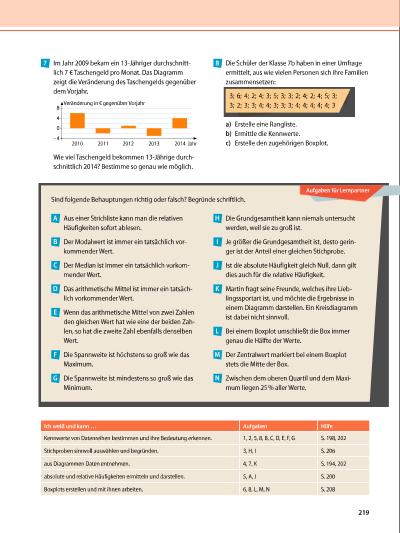 Seite 198 Daten sammeln ▪▪ Urliste: ungeordnete Daten ▪▪ Strichliste: Abzählen der Daten durch Striche ▪▪ Häufigkeitstabelle: Angabe der Daten als absolute (relative) Häufigkeit Strichliste Anna Nikos Lisa Häufigkeitstabelle Name Anzahl Anna 4 Nikos 3 Lisa 6 Seite 200 Daten auswerten ▪▪ Absolute Häufigkeit H: tatsächliche Anzahl, wie oft ein Ergebnis vorkommt. ▪▪ Relative Häufigkeit h: Anteil eines Ergebnisses in Bezug auf Gesamtanzahl aller Ergebnisse Datenreihe: 1; 2; 6; 3; 6; 4; 5; 3; 2; 4; 6; 3 absolute Häufigkeit: H (6) = 3 relative Häufigkeit: h (6) = absolute Häufigkeit für 6 ___________________ Gesamtanzahl aller Zahlen = 3 ___ 12 = 1 __ 4 Seite 202 Kennwerte von Daten Kennwerte, die die Streuung von Daten beschreiben: ▪▪ Minimum: kleinster Datenwert ▪▪ Maximum: größter Datenwert ▪▪ Spannweite: Unterschied zwischen Minimum und Maximum Kennwerte, die Daten durch einen zentralen Wert beschreiben: ▪▪ Modalwert: häufigster Wert ▪▪ Median: Wert in der Mitte einer geordne ten Datenreihe 1 39 2 3 4 5 0 36 37 38 40 41 42 MaximumMinimum Median 38,5 Spannweite 42 – 36 = 6 Modalwert 38 Anzahl ▪▪ arithmetisches Mittel: _ x = Summe aller Einzelwerte __________________ Anzahl der Einzelwerte _ x = 542 ___ 14 = 38,7 Seite 206 Stichproben ▪▪ Grundgesamtheit: alle vom Sachverhalt betroffenen Personen ▪▪ Stichprobe: zufällig ausgewählter Teil der Grund gesamtheit ▪▪ Stichprobenumfang: Größe der Stichprobe Gesamtheit Stichprobe Seite 208 Boxplots Um bei einer großen Anzahl von Daten einen Überblick über die Verteilung der Daten zu bekommen, bietet sich die Erstel lung eines Boxplots an. Die Box gibt an, in welchem Bereich die mittleren 50 % der Daten liegen. Die Antennen geben an, in welchem Bereich die unteren bzw. oberen 25 % der Daten liegen. 5 10 Antenne AntenneBox 15 Anzahl der Paar Schuhe z = 10 Zentralwert (Median) 5 7 8 8 8 8 8 9 11 11 11 13 14 14 16 18 Qu = 8 Zentralwert der unteren Hälfte: „unteres Quartil“ Qo = 13,5 Zentralwert der oberen Hälfte: „oberes Quartil“ Minimum Maximum 6 Auf einen Blick 220 | |