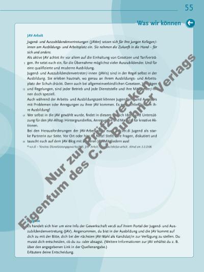 55 1.1 Die Welt der Unternehmen Was wir können Aufgabe Es handelt sich hier um eine Info der Gewerkschaft ver.di auf ihrem Portal der Jugendund Auszubildendenvertretung (JAV). Angenommen, du bist in der Ausbildung und die JAV kommt auf dich zu mit der Bitte, dich bei der nächsten JAV-Wahl als Kandidat/in zur Verfügung zu stellen. Du musst dich entscheiden, ob du zuoder absagst. (Weitere Informationen zur JAV erhältst du z. B. über den angegebenen Link in der Quellenangabe.) Erläutere deine Entscheidung. JAV-Arbeit Jugendund Auszubildendenvertretungen ( JAVen) setzen sich für ihre jungen Kollegen/innen am Ausbildungsund Arbeitsplatz ein. Sie nehmen die Zukunft in die Hand – für sich und andere. Als aktive JAV achtet ihr vor allem auf die Einhaltung von Gesetzen und Tarifverträgen. Ihr setzt euch ein, für die Übernahme möglichst vieler Auszubildender. Und für eine qualifi zierte und moderne Ausbildung. Jugendund Auszubildendenvertreter/-innen (JAVis) sind in der Regel selbst in der Ausbildung. Sie erleben hautnah, wo genau an ihrem Ausbildungsund Arbeitsplatz der Schuh drückt. Denn auch bei allgemeinverbindlichen Gesetzen, Verträgen und Regelungen, sind jeder Betrieb und jede Dienststelle und ihre Mitarbeiter/-innen doch speziell. Auch während der Arbeitsund Ausbildungszeit können Jugendliche und Auszubis mit Problemen oder Anregungen zu ihrer JAV kommen. Es geht schließlich um ihre Ausbildung! Wer selbst in die JAV gewählt wurde, fi ndet in diesem Bereich Ideen und Untersützung für den JAV-Alltag: Hintergrundinfos, Anregungen und Material für kreative Aktionen. Bei den Herausforderungen der JAV-Arbeit steht euch die ver.di Jugend als starke Partnerin zur Seite. Vor Ort oder hier im Netz! Stellt eure Fragen, diskutiert und tauscht euch auf dem JAV-Blog mit an-deren JAV-Mitgliedern aus! © ver.di – Vereinte Dienstleistungsgewerkschaft, JAV Arbeit, www.jav.info/jav-arbeit, Abruf am 3.2.2106 5 10 15 20 Nu r z ur P rü fzw ec ke n Ei en tu m d es C .C . B uc hn er V er la gs | |
