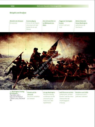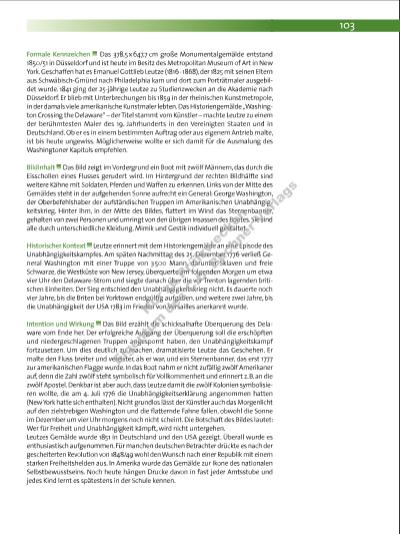 Formale Kennzeichen Das 378,5 x 647,7 cm große Monumentalgemälde entstand 1850/51 in Düsseldorf und ist heute im Besitz des Metropolitan Museum of Art in New York. Geschaf fen hat es Emanuel Gottlieb Leutze (1816 1868), der 1825 mit seinen Eltern aus Schwäbisch-Gmünd nach Philadelphia kam und dort zum Porträtmaler ausgebildet wurde. 1841 ging der 25-jährige Leutze zu Studienzwecken an die Akademie nach Düsseldorf. Er blieb mit Unterbrechungen bis 1859 in der rheinischen Kunstmetropole, in der damals viele amerikanische Kunstmaler lebten. Das Historiengemälde „Washington Crossing the Delaware“ – der Titel stammt vom Künstler – machte Leutze zu einem der berühmtesten Maler des 19. Jahrhunderts in den Vereinigten Staaten und in Deutschland. Ob er es in einem bestimmten Auftrag oder aus eigenem Antrieb malte, ist bis heute ungewiss. Möglicherweise wollte er sich damit für die Ausmalung des Washingtoner Kapitols empfehlen. Bildinhalt Das Bild zeigt im Vordergrund ein Boot mit zwölf Männern, das durch die Eisschollen eines Flusses gerudert wird. Im Hintergrund der rechten Bildhälfte sind weitere Kähne mit Soldaten, Pferden und Waffen zu erkennen. Links von der Mitte des Gemäldes steht in der aufgehenden Sonne aufrecht ein General: George Washington, der Oberbefehlshaber der aufständischen Truppen im Amerikanischen Unabhängigkeitskrieg. Hinter ihm, in der Mitte des Bildes, fl attert im Wind das Sternenbanner, gehalten von zwei Personen und umringt von den übrigen Insassen des Bootes. Sie sind alle durch unterschiedliche Kleidung, Mimik und Gestik individuell gestaltet. Historischer Kontext Leutze erinnert mit dem Historiengemälde an eine Episode des Unabhängigkeitskampfes. Am späten Nachmittag des 25. Dezember 1776 verließ General Washington mit einer Truppe von 3 500 Mann, darunter Sklaven und freie Schwarze, die Westküste von New Jersey, überquerte am folgenden Morgen um etwa vier Uhr den Delaware-Strom und siegte danach über die vor Trenton lagernden britischen Einheiten. Der Sieg entschied den Unabhängigkeitskrieg nicht. Es dauerte noch vier Jahre, bis die Briten bei Yorktown endgültig aufgaben, und weitere zwei Jahre, bis die Unabhängigkeit der USA 1783 im Frieden von Versailles anerkannt wurde. Intention und Wirkung Das Bild erzählt die schicksalhafte Überquerung des Delaware vom Ende her. Der erfolgreiche Ausgang der Überquerung soll die erschöpften und niedergeschlagenen Truppen angespornt haben, den Unabhängigkeitskampf fortzusetzen. Um dies deutlich zu machen, dramatisierte Leutze das Geschehen. Er malte den Fluss breiter und vereister, als er war, und ein Sternenbanner, das erst 1777 zur amerikanischen Flagge wurde. In das Boot nahm er nicht zufällig zwölf Amerikaner auf, denn die Zahl zwölf steht symbolisch für Vollkommenheit und erinnert z. B. an die zwölf Apostel. Denkbar ist aber auch, dass Leutze damit die zwölf Kolonien symbolisieren wollte, die am 4. Juli 1776 die Unabhängigkeitserklärung angenommen hatten (New York hatte sich enthalten). Nicht grundlos lässt der Künstler auch das Morgenlicht auf den zielstrebigen Washington und die fl atternde Fahne fallen, obwohl die Sonne im Dezember um vier Uhr morgens noch nicht scheint. Die Botschaft des Bildes lautet: Wer für Freiheit und Unabhängigkeit kämpft, wird nicht untergehen. Leutzes Gemälde wurde 1851 in Deutschland und den USA gezeigt. Überall wurde es enthusiastisch aufgenommen. Für manchen deutschen Betrachter drückte es nach der gescheiterten Revolution von 1848/49 wohl den Wunsch nach einer Republik mit einem starken Freiheitshelden aus. In Amerika wurde das Gemälde zur Ikone des nationalen Selbstbewusstseins. Noch heute hängen Drucke davon in fast jeder Amtsstube und jedes Kind lernt es spätestens in der Schule kennen. 103 7316_1_1_2015_080-107_Krisen_Revolutionen.indd 103 05.05.15 13:01 Nu r z u Pr üf zw ec ke n Ei ge nt um d es C .C . B uc hn er V er la gs | |