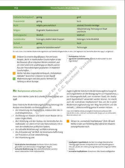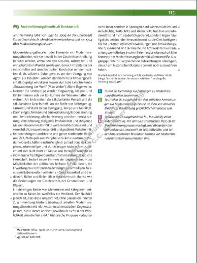 113 M3 Modernisierungstheorie als Denkanstoß Jens Flemming lehrt von 1992 bis 2009 an der Universität Kassel Geschichte. Er schreibt in einem Lexikonartikel von 1994 über Modernisierungstheorien: Modernisierungstheorien oder Elemente von Modernisierungstheorien, wie sie derzeit in der Geschichtsschreibung benutzt werden, versuchen den sozialen, kulturellen und wirtschaftlichen Wandel zu erfassen, der sich im Zeitalter der industriellen und demokratischen Revolution seit dem späten 18. Jh. vollzieht. Dabei geht es um den Übergang von Agrarzur Industrie-, von der ständischen zur Klassengesellschaft. Geprägt wird dieser Prozess durch die fortschreitende „Entzauberung der Welt“ (Max Weber1). Ältere Regelwerke, Normen für Sinnbezüge werden fragwürdig, Religion und Kirche müssen sich der Konkurrenz der Wissenschaften erwehren. Am Ende stehen der säkularisierte Mensch und die säkula risierte Gesellschaft. An die Stelle von Selbstgenügsamkeit und Statik treten Bewegung, Tempo und Mobilität. Darin eingeschlossen sind Bürokratisierung, Rationalisierung und Zentralisierung, Mechanisierung und Kommerzialisierung, Verstädterung, steigende Produktivität und steigende Masseneinkommen. Konfl ikte werden institutionalisiert und verrechtlicht, insoweit entschärft und gezähmt. Verkehrsmittel durchdringen Landstriche und ganze Kontinente, Raum und Zeit, Metropole und Peripherie rücken zusammen. Moderne Gesellschaften sind im Vergleich zu traditionalen komplexer, arbeits teiliger und durchlässiger. Sozialer Status orientiert sich nicht mehr an Geburt und Herkunft, sondern an individueller Tüchtigkeit und berufl icher Leistung. Staatliche Herrschaft bedarf neuer Formen der Legitimation, muss Möglichkeiten der politischen Teilhabe für alle bieten, die Erwartungen und Interessen der Bürger zu befriedigen. Milieus und Lebenswelten verlieren an Geschlossenheit und Bindekraft, Rollen und Rollenbilder verändern sich ebenso wie die Beziehungen der Geschlechter, der Generationen und Klassen. Ein derartiges Raster von Merkmalen und Kategorien entworfen zu haben ist zweifellos ein Verdienst. Der Nachteil jedoch ist, dass diese ungeordnet, ohne plausiblen inneren Zusammenhang bleiben; überhaupt arbeiten Modernisierungstheorien mit relativ starren, schematischen Gegensatzpaaren, die in dieser Reinheit gewöhnlich nicht in der Wirklichkeit anzutreffen sind.2 Historische Prozesse verlaufen 5 10 15 20 25 30 35 40 45 50 1 Max Weber (1864 1920): deutscher Jurist, Soziologe und Nationalökonom 2 Vgl. M1 auf Seite 111 f. nicht linear, sondern in Sprüngen, sind widersprüchlich und vielschichtig. Fortschritt und Rückschritt, Tradition und Modernität sind nicht säuberlich getrennt, sondern liegen häufi g dicht beieinander. Kennzeichnend ist die Gleichzeitigkeit höchst unterschiedlicher Entwicklungen und Entwicklungslinien, spannend sind die Brüche, die Ambivalenzen und Mischungsverhältnisse. Insofern liefern sozialwissenschaftliche Konzepte der Modernisierung bestenfalls Denkanstöße, Ausgangspunkte für vergleichende Betrachtungen. Idealtypen, die sich am historischen Material aber erst noch zu bewähren haben. Manfred Asendorf, Jens Flemming, Achatz von Müller und Volker Ullrich (Hrsg.), Geschichte. Lexikon der wissenschaft lichen Grundbegriffe, Hamburg 1994, S. 446 f. 1. Fassen Sie Flemmings Ausführungen zu Modernisierungstheorien zusammen. 2. Beurteilen Sie ausgehend von den kritischen Anmerkungen zur Modernisierungstheorie, ob diese ein sinnvolles Modell zur Betrachtung geschichtlicher Prozesse sein können. 3. Entwickeln Sie ausgehend von M1, M2 und M3 einen Kriterienkatalog, mit dem sich untersuchen lässt, ob ein Modernisierungsprozess vorliegt, und überprüfen Sie anhand dessen, inwieweit im Spätmittelalter und bei der Amerikanischen Revolution Formen von Modernisierungsprozessen auszumachen sind. 7316_1_1_2015_108-113_Krisen_Revolutionen.indd 113 05.05.15 13:01 Nu r z u Pr üf zw ec ke n Ei ge nt um d es C .C . B uc hn r V er la gs | |