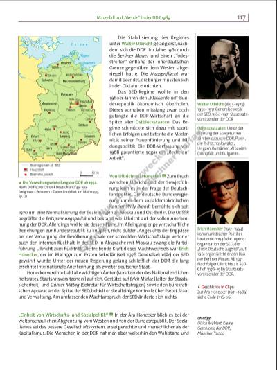 117Mauerfall und „Wende“ in der DDR 1989 Die Stabilisierung des Regimes unter Walter Ulbricht gelang erst, nachdem sich die DDR im Jahre 1961 durch die Berliner Mauer und einen „Todesstreifen“ entlang der innerdeutschen Grenze gegenüber dem Westen abgeriegelt hatte. Die Massenflucht war damit beendet, die Bürger mussten sich in der Diktatur einrichten. Das SED-Regime wollte in den 1960er-Jahren den „Klassenfeind“ Bundesrepublik ökonomisch überholen. Dieses Vorhaben misslang zwar, doch gelangte die DDR-Wirtschaft an die Spitze aller Ostblockstaaten. Das Regime schmückte sich dazu mit sportlichen Erfolgen und betonte die Modernität seiner Frauenförderung und Bildungspolitik. Die DDR-Verfassung von 1968 garantierte sogar ein „Recht auf Arbeit“. Von Ulbricht zu Honecker Zum Bruch zwischen Ulbricht und der Sowjetführung kam es in der Frage der Deutschlandpolitik. Die deutsche Bundesregierung unter dem sozialdemokratischen Kanzler Willy Brandt bemühte sich seit 1970 um eine Normalisierung der Beziehungen zu Moskau und Ost-Berlin. Die UdSSR begrüßte die Entspannungspolitik und bestand wie Ulbricht auf der vollen Anerkennung der DDR. Allerdings wollte sie dessen Pläne, im Alleingang enge wirtschaftliche Beziehungen zur Bundesrepublik zu knüpfen, nicht dulden. Angesichts der Engpässe bei der Versorgung der Bevölkerung sowie der schlechten Wirtschaftslage verlor er auch den internen Rückhalt in der SED. In Absprache mit Moskau zwang die Parteiführung Ulbricht zum Rücktritt. Die treibende Kraft dieses Machtwechsels war Erich Honecker, der im Mai 1971 zum Ersten Sekretär (seit 1976 Generalsekretär) der SED gewählt wurde. Unter der neuen Regierung gelang schließlich der DDR die lang ersehnte internationale Anerkennung als zweiter deutscher Staat. Honecker vereinte bald alle wichtigen Ämter (Vorsitzender des Nationalen Sicherheitsrates, Staatsratsvorsitzender) auf sich. Gestützt auf Erich Mielke (Leiter der Staatssicherheit) und Günter Mittag (Sekretär für Wirtschaftsfragen) sowie den bürokratischen Apparat an der Spitze der SED, behielt er die alleinige Kontrolle über Partei, Staat und Verwaltung. Am umfassenden Machtanspruch der SED änderte sich nichts. „Einheit von Wirtschaftsund Sozialpolitik“ In der Ära Honecker blieb es bei der weltanschaulichen Abgrenzung vom Westen und von der Bundesrepublik. Der Sozialismus sei das bessere Gesellschaftssystem, er sei gerechter und menschlicher als der Kapitalismus. Die Menschen in der DDR nahmen aber weiterhin den Wohlstand und Ostblockstaaten: Unter der Führung der Sowjetunion zählten dazu die DDR, Polen, die Tschechoslowakei, Ungarn, Rumänien, Albanien (bis 1968) und Bulgarien. Erich Honecker (1912 1994): kommunistischer Politiker, baute nach 1946 die Jugendorganisation der SED, die „Freie Deutsche Jugend“, auf. 1961 organisierte er den Bau der Berliner Mauer. Ab 1971 Nachfolger Ulbrichts als SEDChef; 1976 1989 Staatsratsvorsitzender der DDR. Lesetipp Ulrich Mählert, Kleine Geschichte der DDR, München 62009 Walter Ulbricht (1893 1973): 1950 1971 Generalsekretär der SED, 1960 1971 Staatsratsvorsitzender der DDR O s t s e e Rügen Usedom Berlin Potsdam Rostock Schwerin Leipzig Halle Erfurt Dresden Cottbus Magdeburg Suhl Gera Karl-Marx-Stadt (Chemnitz) Neubrandenburg (West) (Ost) Frankfurt/O. GeraSuhl Erfurt Halle Leipzig Potsdam Rostock Schwerin Cottbus Magdeburg Neubrandenburg Frankfurt Dresden Karl-Marx-Stadt Berlin Bezirksgrenzen ab 1952 Hauptstadt Bezirkshauptstadt 0 50 km i Die Verwaltungseinteilung der DDR ab 1952. Nach: Die Fischer Chronik Deutschland ’49 ’99. Ereignisse – Personen – Daten, Frankfurt am Main 1999, Sp. 121 u Geschichte In Clips: Zur Ära Honecker (1971 1989) siehe Code 7316-06 7316_1_1_2015_114-137_Krisen_Revolutionen.indd 117 05.05.15 13:09 Nu r z u Pr üf zw ec ke n Ei ge nt um d es C .C . B uc hn er V er la gs | |
