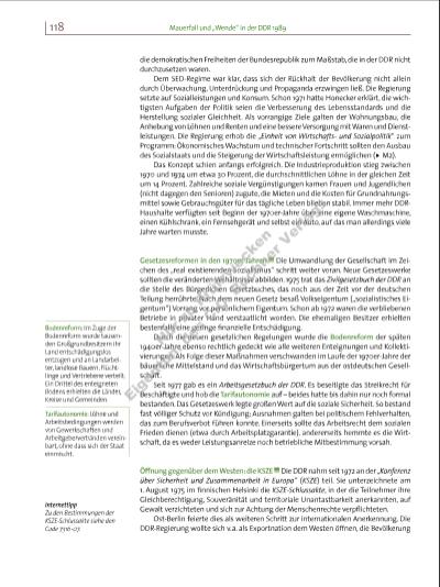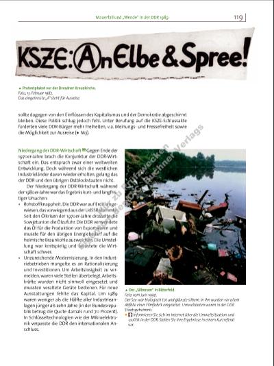 119Mauerfall und „Wende“ in der DDR 1989 sollte dagegen von den Einfl üssen des Kapitalismus und der Demokratie abgeschirmt bleiben. Diese Politik schlug jedoch fehl. Unter Berufung auf die KSZE-Schlussakte forderten viele DDR-Bürger mehr Freiheiten, v. a. Meinungsund Pressefreiheit sowie die Möglichkeit zur Ausreise (u M3). Niedergang der DDR-Wirtschaft Gegen Ende der 1970er-Jahre brach die Konjunktur der DDR-Wirtschaft ein. Das entsprach zwar einer weltweiten Entwicklung. Doch während sich die westlichen Industrieländer davon wieder erholten, gelang das der DDR und den übrigen Ostblockstaaten nicht. Der Niedergang der DDR-Wirtschaft während der 1980er-Jahre war das Ergebnis kurzund langfristiger Ursachen: • Rohstoffknappheit. Die DDR war auf Erdöl angewiesen, das vorwiegend aus der UdSSR stammte. Seit den Ölkrisen der 1970er-Jahre drosselte die Sowjetunion die Ölzufuhr. Die DDR verwendete das Öl für die Produktion von Exportwaren und musste für den übrigen Energiebedarf auf die heimische Braunkohle ausweichen. Die Umstellung war kostspielig und belastete die Wirtschaft schwer. • Unzureichende Modernisierung. In den Industriebetrieben mangelte es an Rationalisierung und Investitionen. Um Arbeitslosigkeit zu vermeiden, waren viele Stellen überbelegt, Arbeitskräfte wurden nicht sinnvoll eingesetzt und mussten ver altete Geräte bedienen. Für neue Ausstattungen fehlte das Kapital. Um 1989 waren weniger als die Hälfte aller Industrieanlagen jünger als zehn Jahre (in der Bundesrepublik betrug die Quote damals rund 70 Prozent). In Schlüsseltechnologien wie der Mikroelektronik verpasste die DDR den internationalen Anschluss. i Protestplakat vor der Dresdner Kreuzkirche. Foto, 13. Februar 1982. Das eingekreiste „A“ steht für Ausreise. i Der „Silbersee“ in Bitterfeld. Foto vom Juni 1990. Der See war biologisch tot und glänzte silbern. In ihn wurden vor allem Abfälle einer Filmfabrik eingeleitet. Umweltdaten waren in der DDR Staatsgeheimnis. p Informieren Sie sich im Internet über die Umweltsituation und -politik in der DDR. Stellen Sie Ihre Ergebnisse in einem Kurzreferat vor. 7316_1_1_2015_114-137_Krisen_Revolutionen.indd 119 05.05.15 13:09 Nu r z u Pr üf zw ec ke n Ei ge nt um d es C .C . B uc hn er V er la gs | |